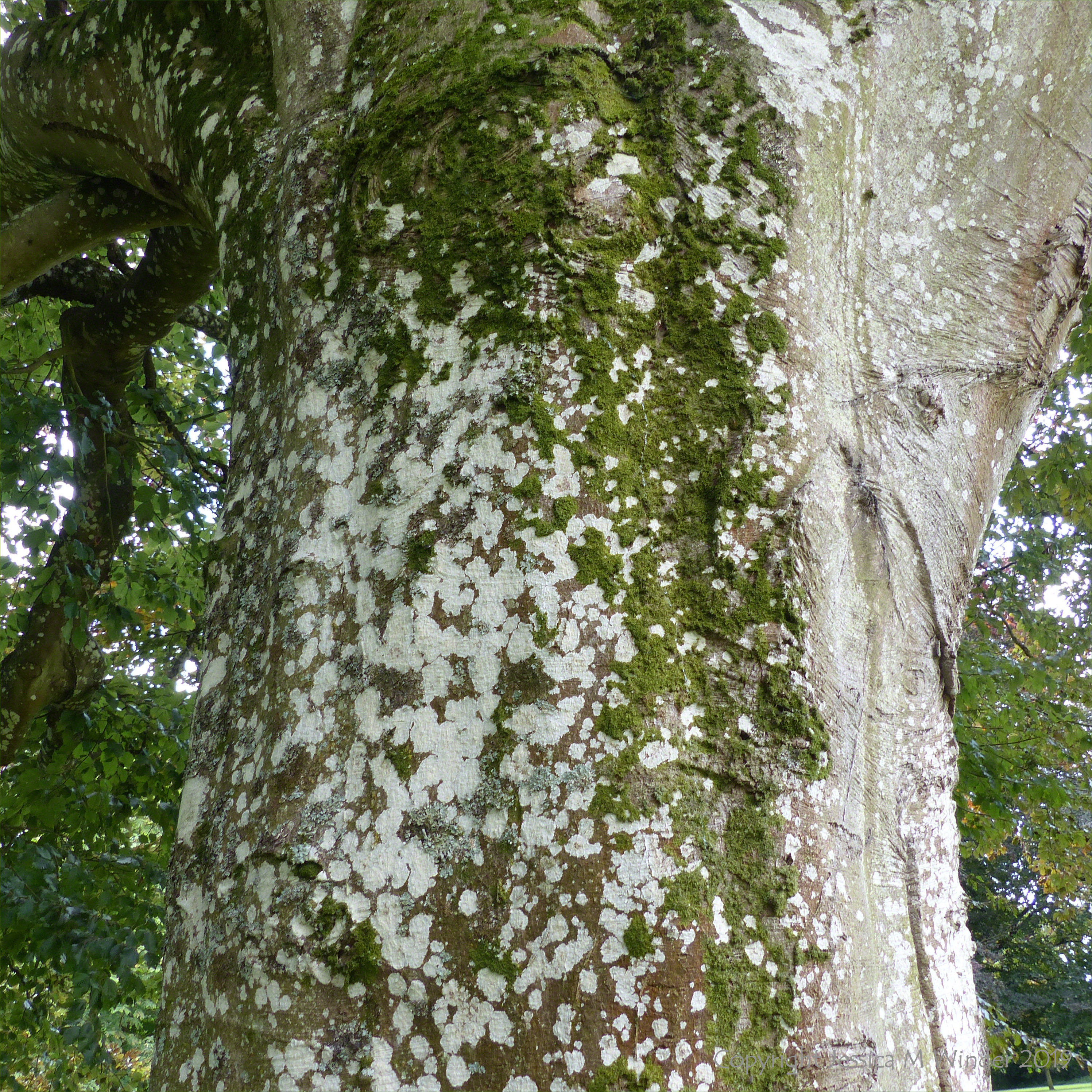 Lichen and moss on the trunk of an old purple or copper beech tree by the path in Charlton Down, Dorset, September 2019
