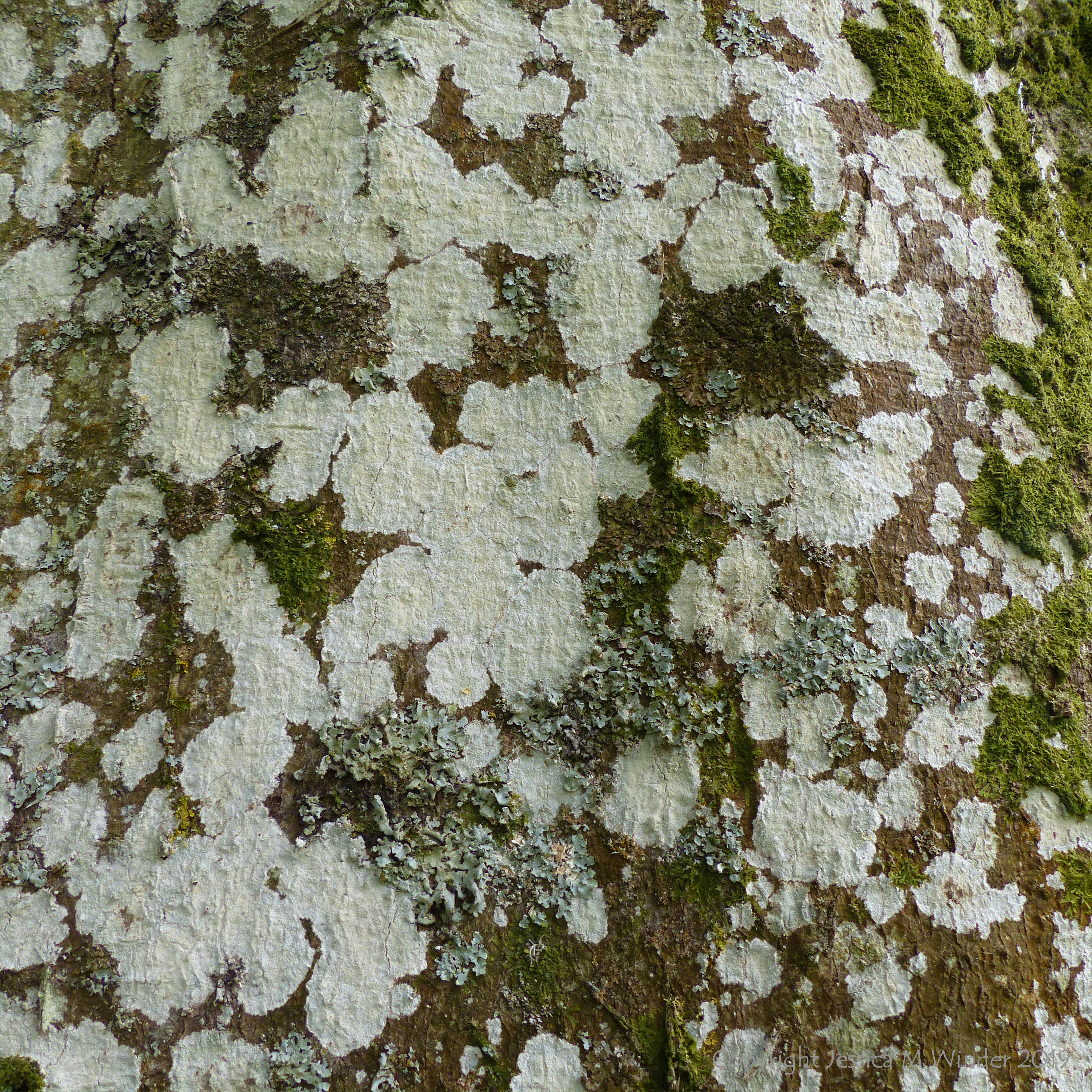 Lichen and moss on the trunk of an old purple or copper beech tree by the path in Charlton Down, Dorset, September 2019