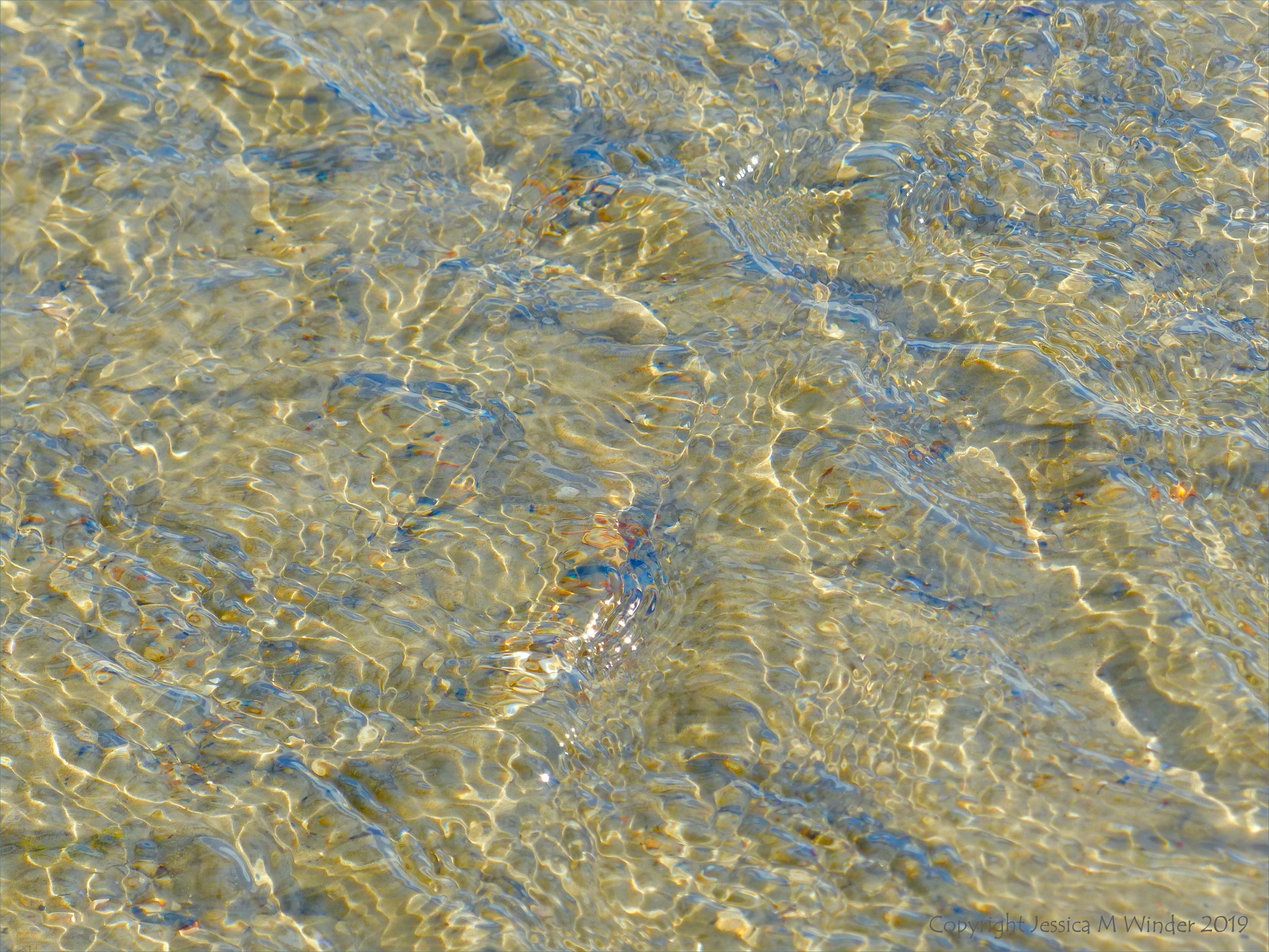 Natural wind-driven ripple patterns on shallow water over sand with reflected colours of the sky at Weymouth Beach in Dorset September 2019