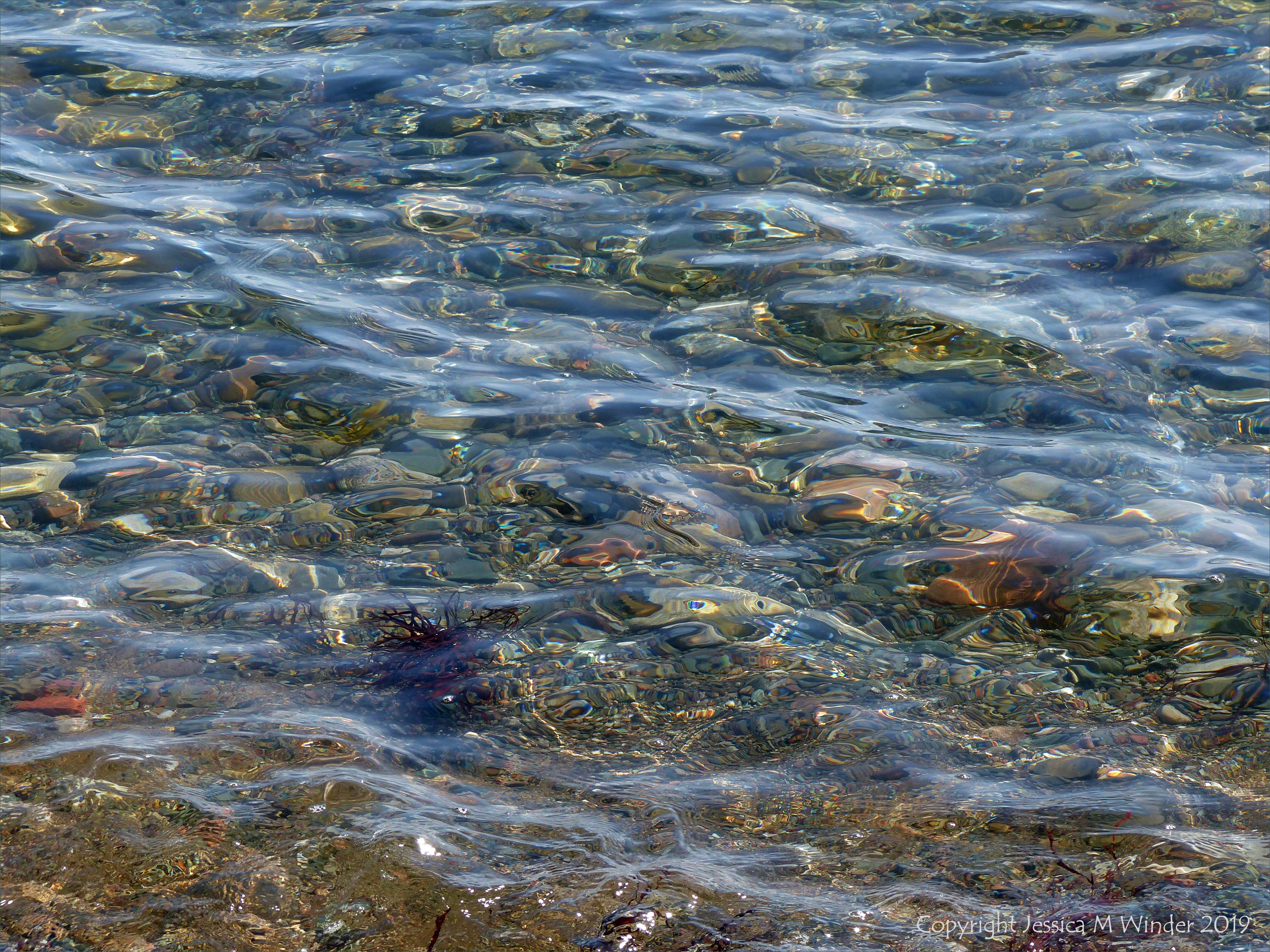 Crystal Cliffs Water Patterns 1 Looking through clear shallow water to the coloured beach stones below at Crystal Cliffs in Nova Scotia.