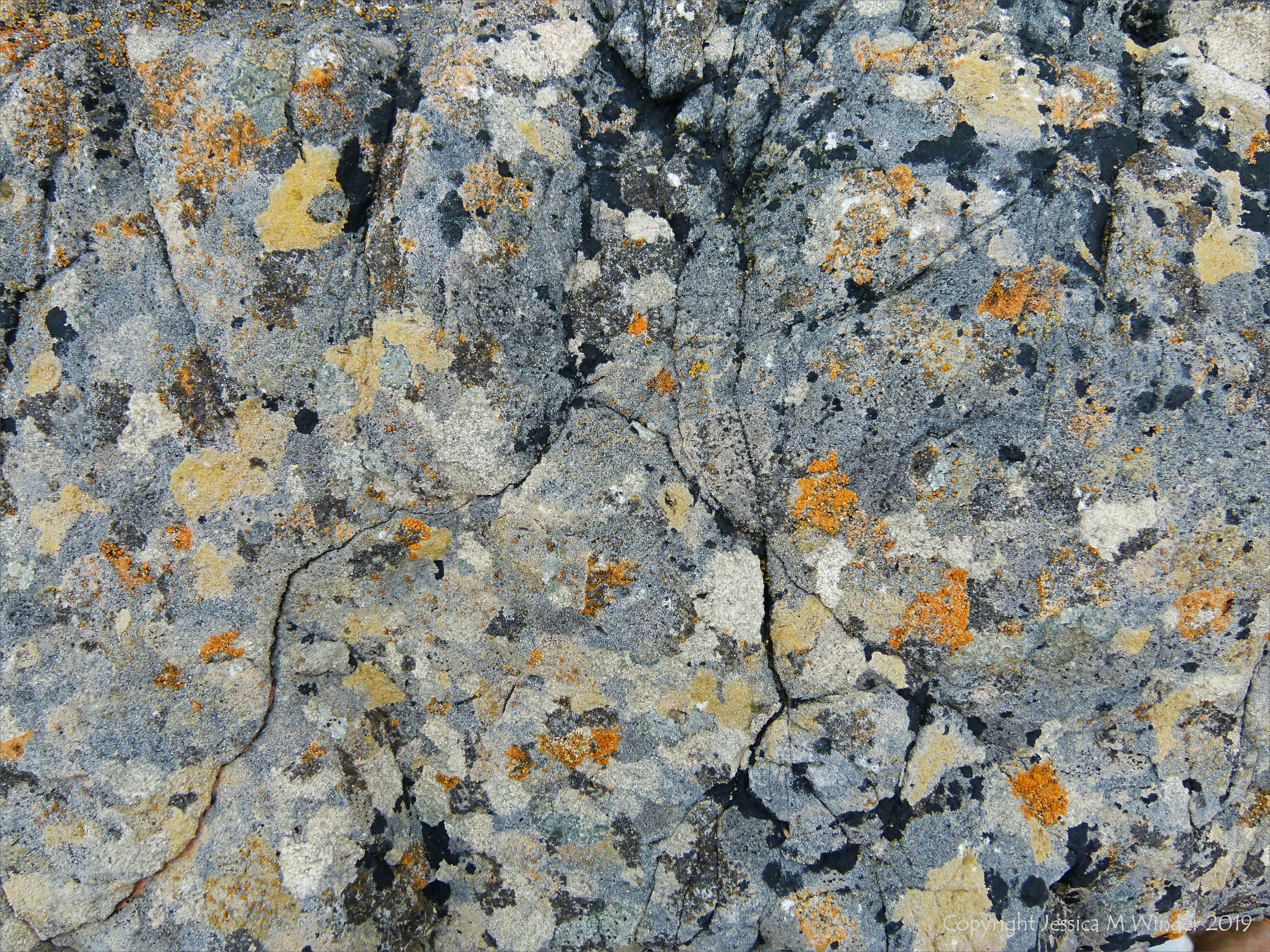 Lichens of different colours growing on Carboniferous limestone rocks on the shore at Broughton Bay in Gower, South Wales, June 2012