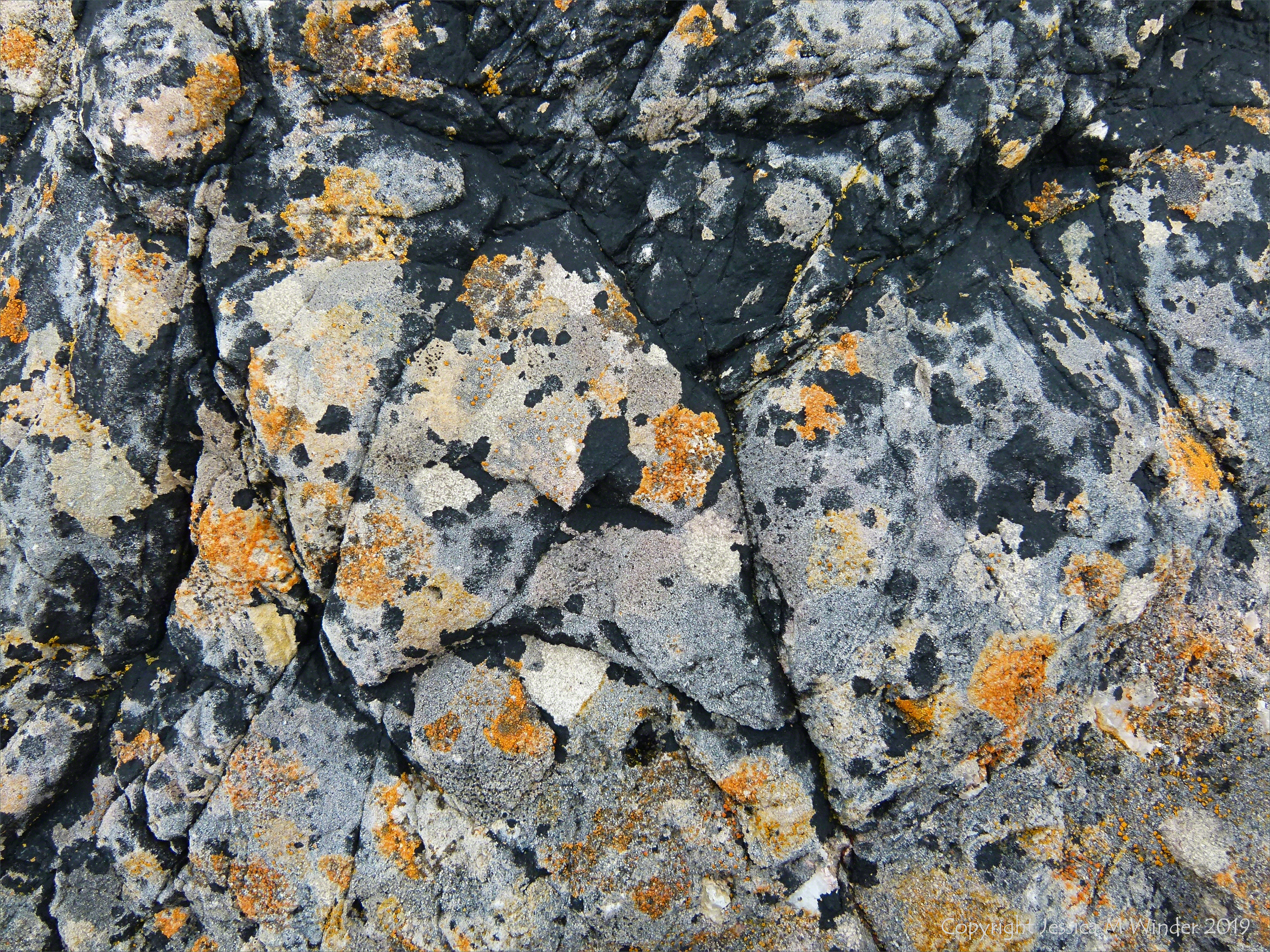 Lichens of different colours growing on Carboniferous limestone rocks on the shore at Broughton Bay in Gower, South Wales, June 2012