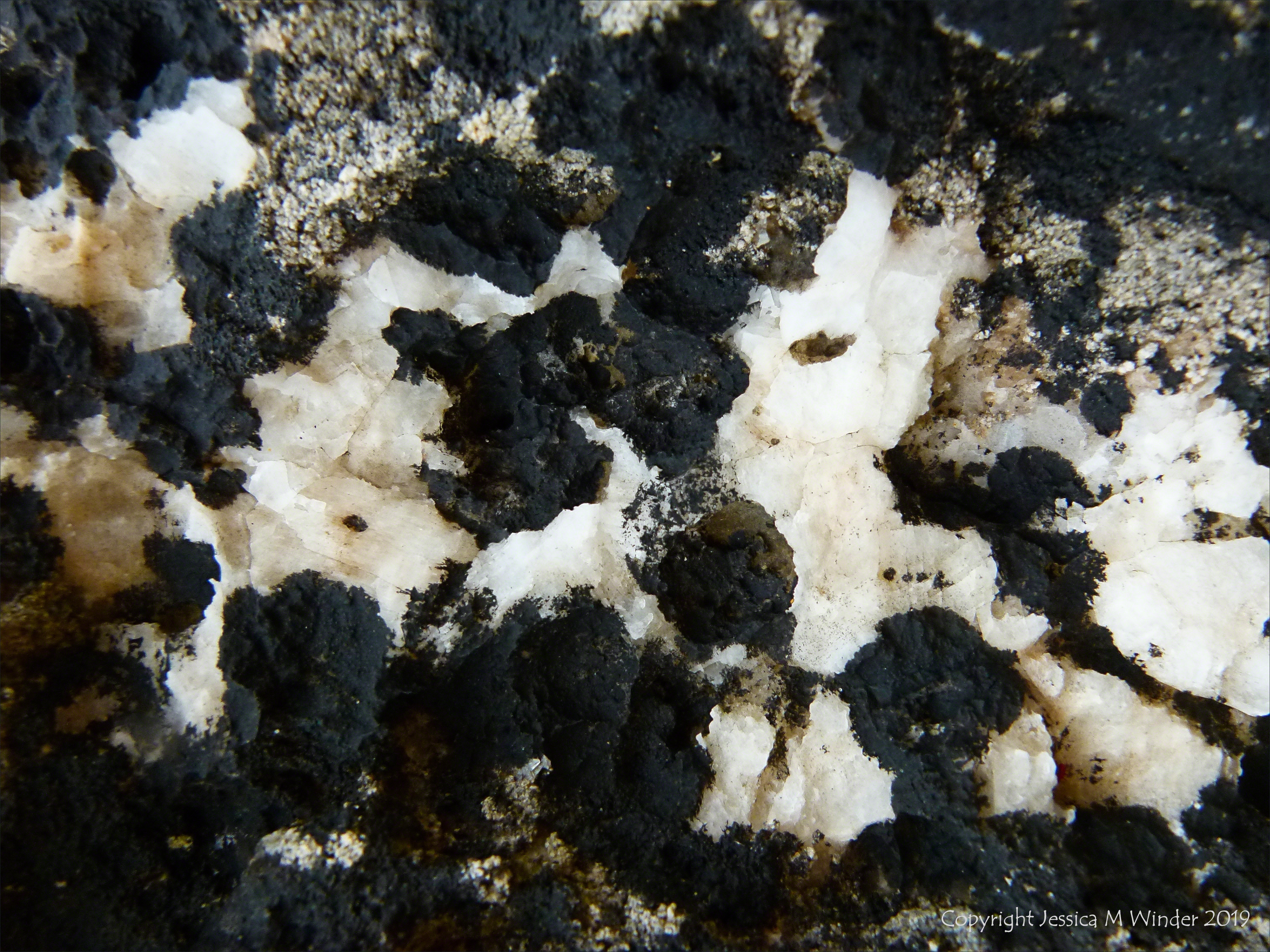 Lichens of different colours growing on Carboniferous limestone rocks on the shore at Broughton Bay in Gower, South Wales, June 2012
