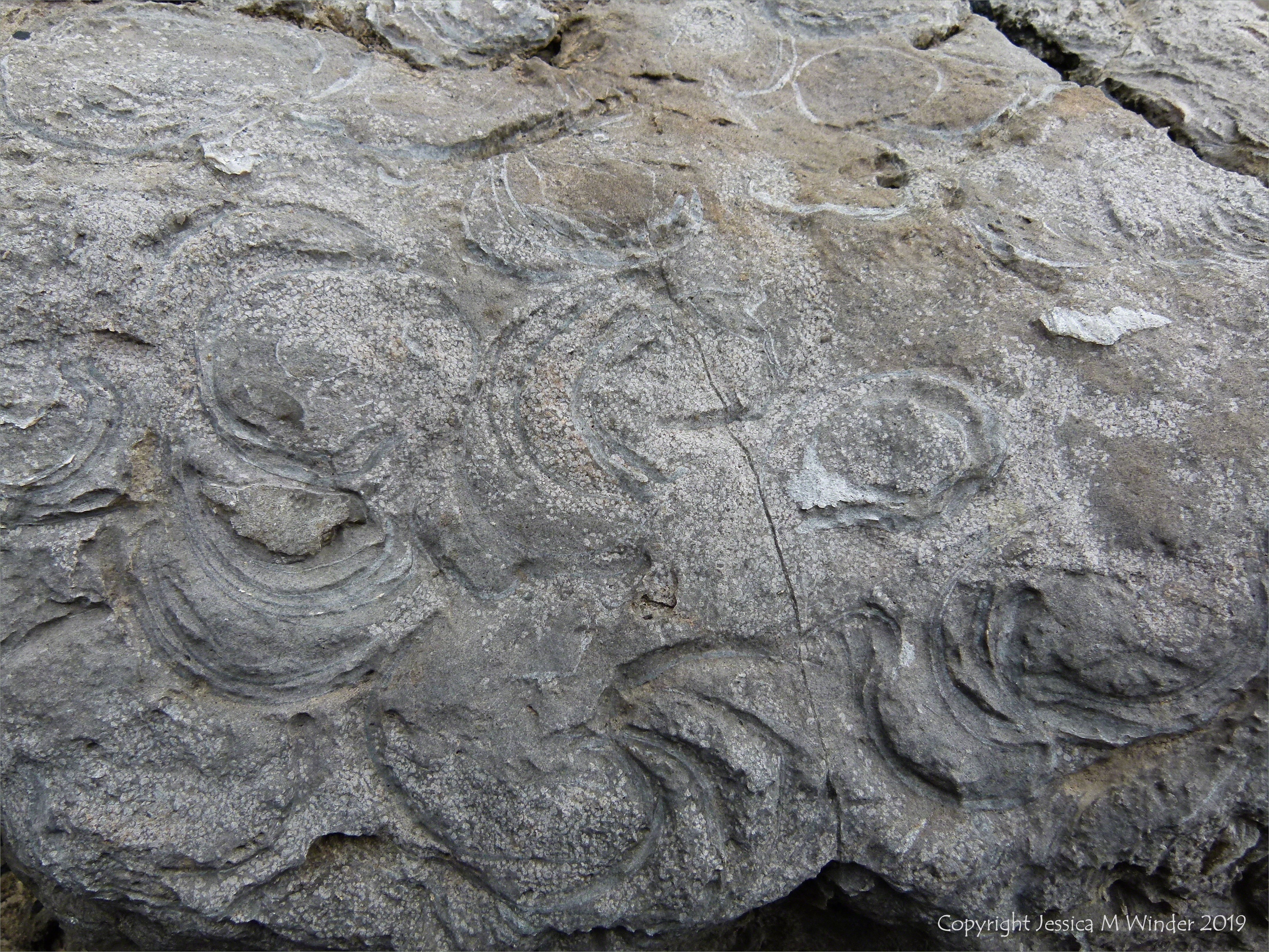 Fossil shells of either bivalves or brachiopods in Carboniferous Limestone on the shore at Broughton Bay in Gower, South Wales