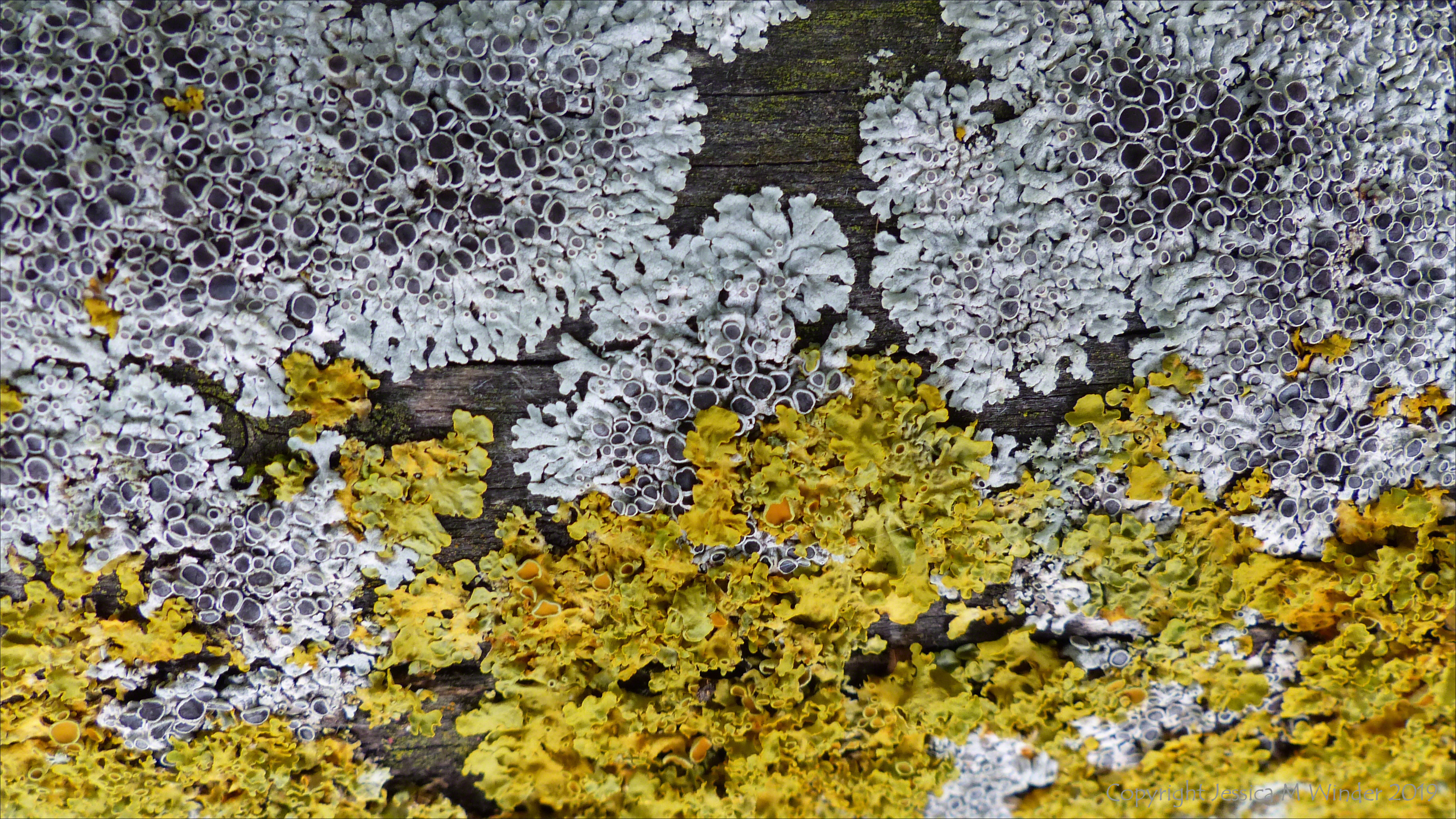 Lichen On Fence 4 Yellow and grey lichens growing on wooden fencing around the village cricket pitch in Charlton Down, Dorset.