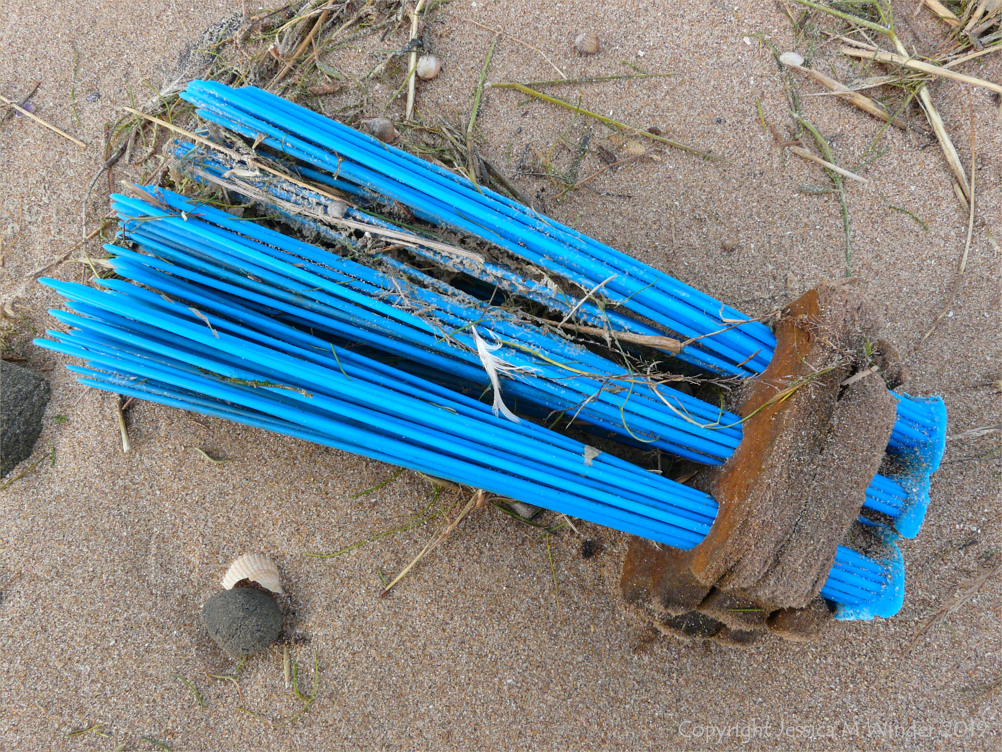 Blue plastic bristles in a wooden base from a brush washed ashore as flotsam