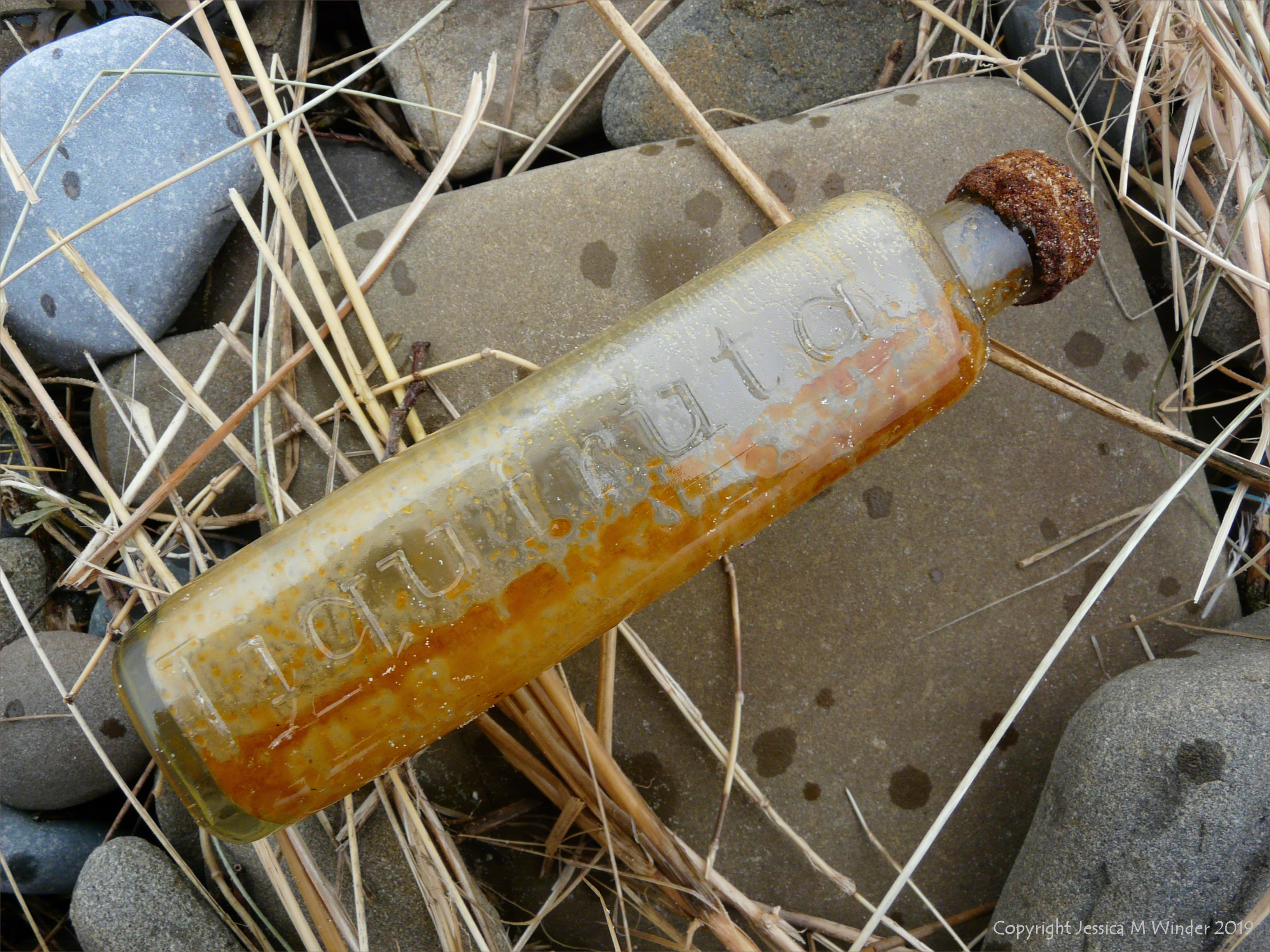Old cough medicine bottle with rusty cap washed up as flotsam