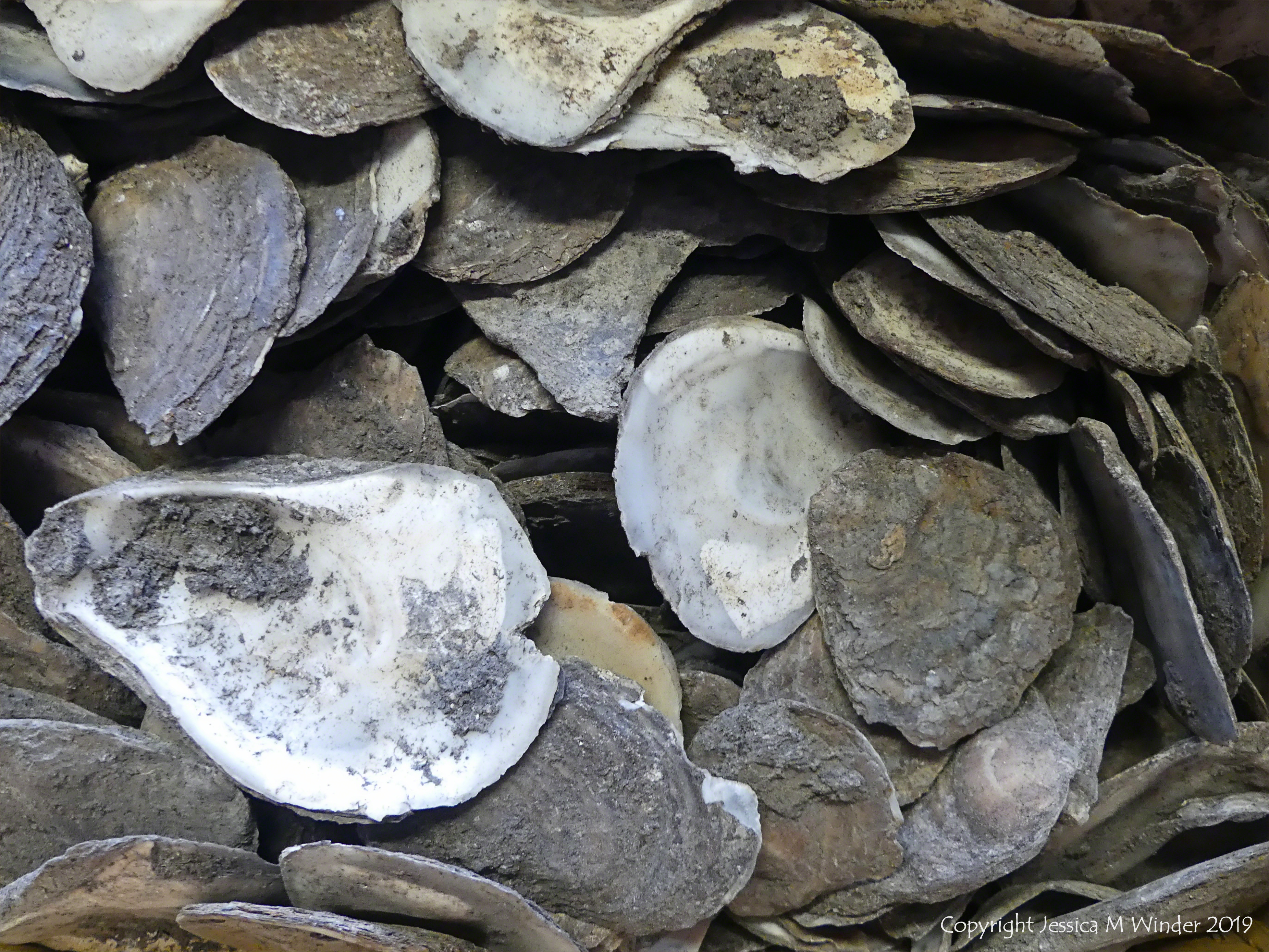 Flat oyster shell right valves (Ostrea edulis) from an archaeological excavation.