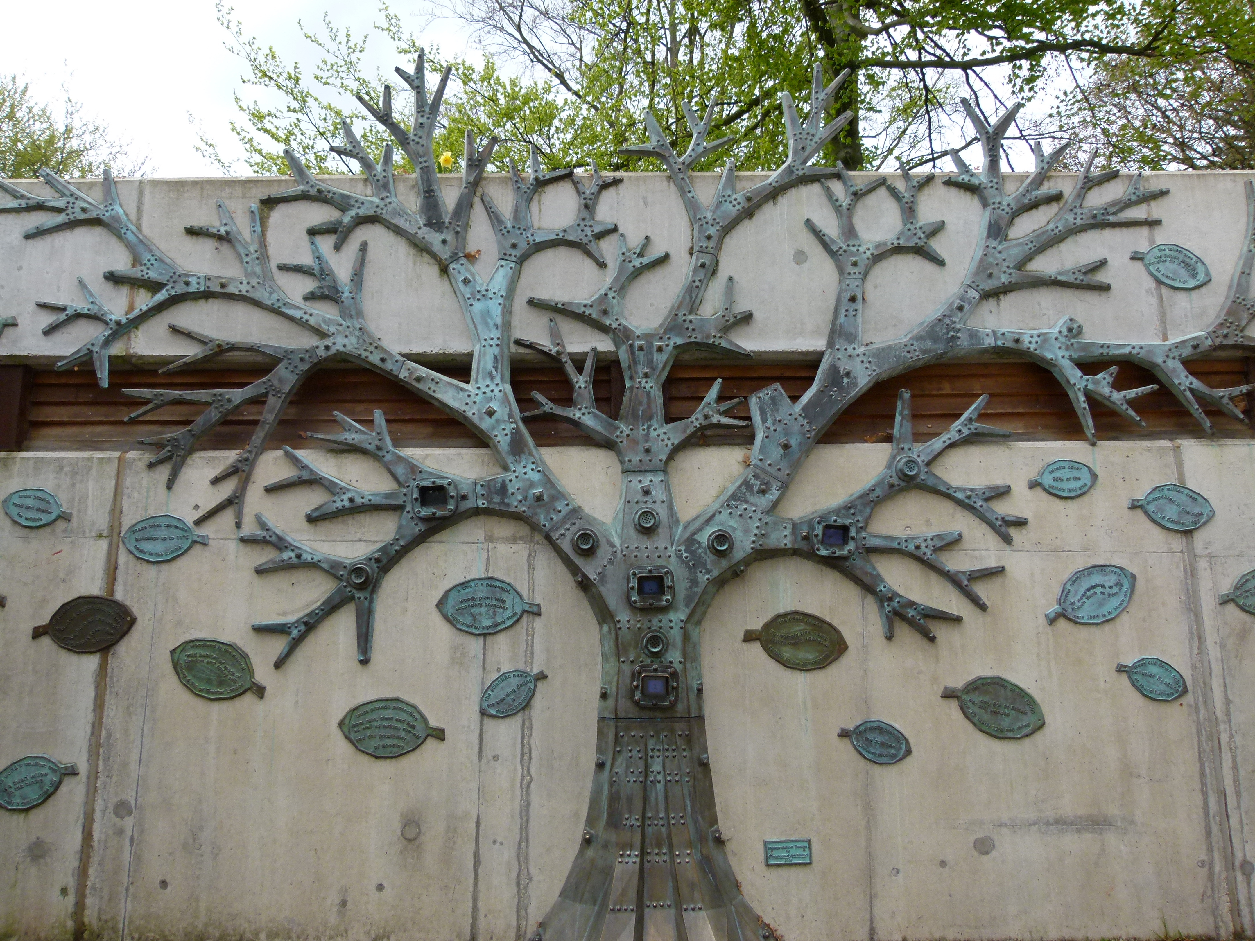 Facts about Trees – Kew Sculpture (1) – Bronze sculpture of a tree with separate leaf plaques with facts about trees – photographed at Royal Botanic Gardens, Kew, London. P1340610