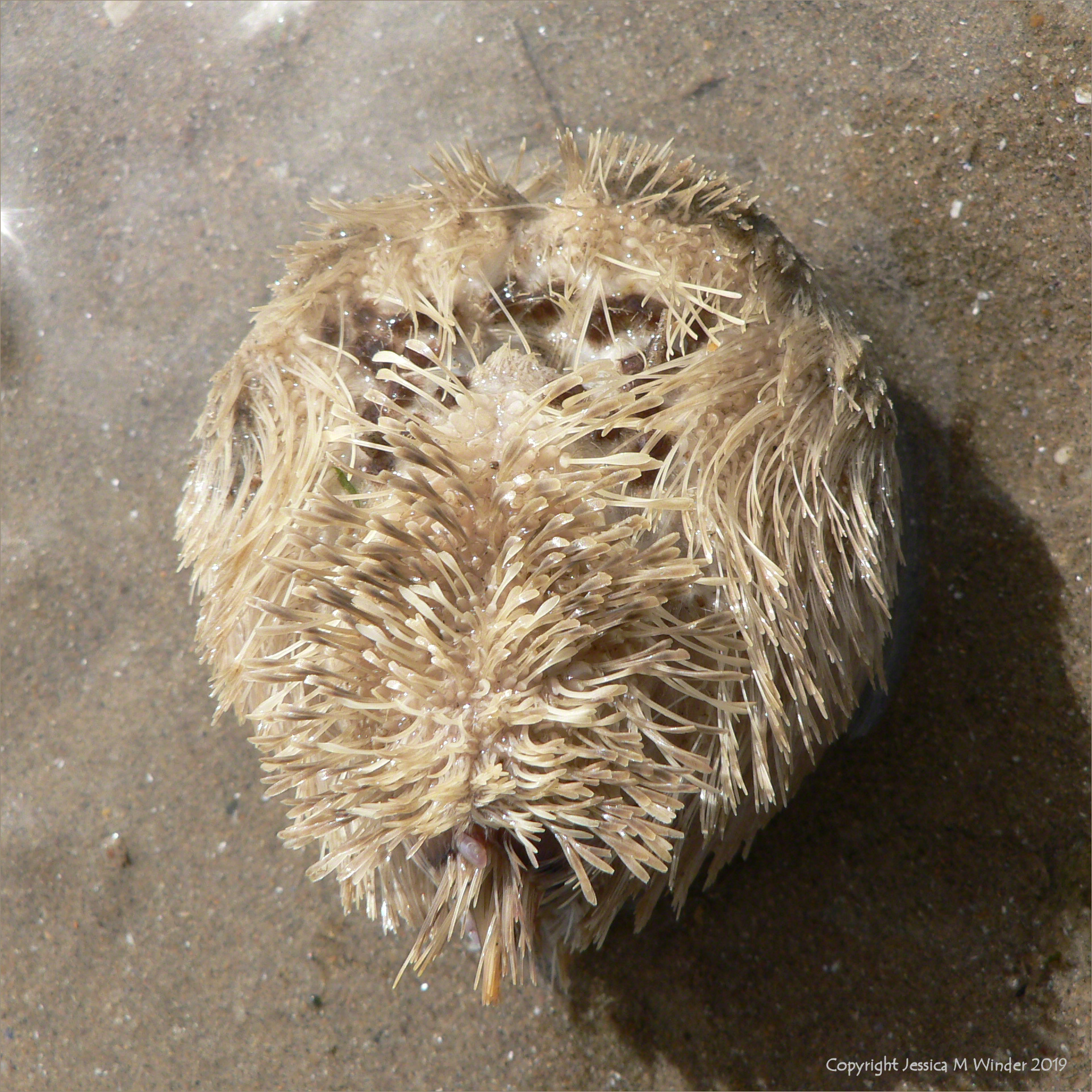 Living ‘Sea Potato’ sea urchin, Echinocardium cordatum (Pennant), with live bivalved molluscs, Tellimya ferruginosa (Montagu), on the low tide sand at Port Eynon, Gower, South Wales, UK (7)