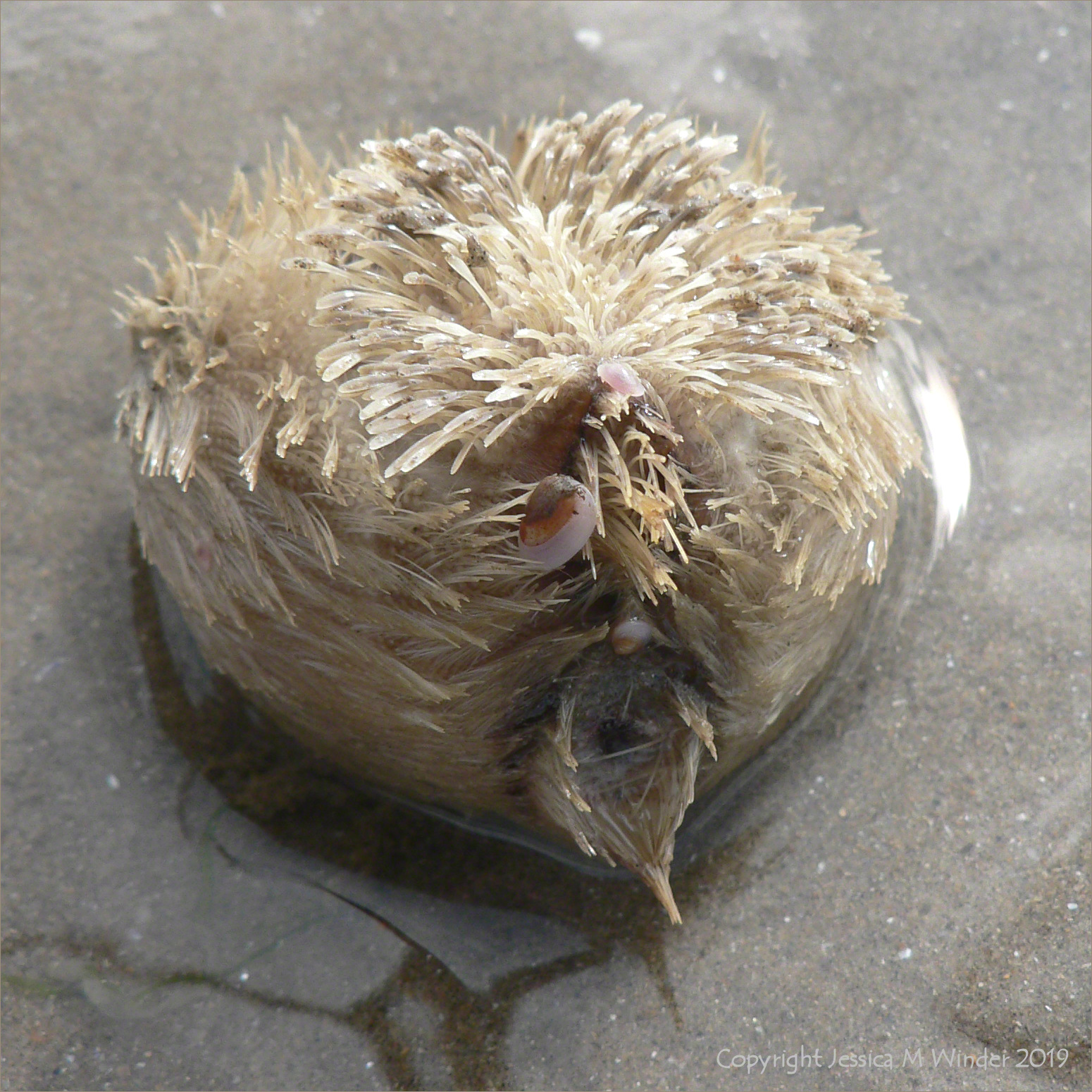Living ‘Sea Potato’ sea urchin, Echinocardium cordatum (Pennant), with live bivalved molluscs, Tellimya ferruginosa (Montagu), on the low tide sand at Port Eynon, Gower, South Wales, UK (2)