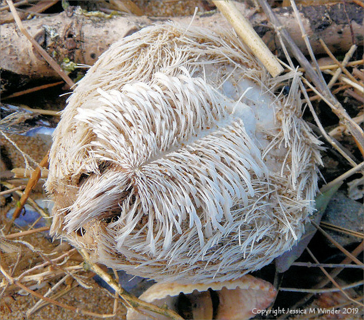 Sea urchin test with spines: The empty test or shell of the Heart Urchin commonly known as the Sea Potato, Echinocardium cordatum (Pennant), from Whiteford Sands strandline, Gower, South Wales. Under surface with spines still attached (1)