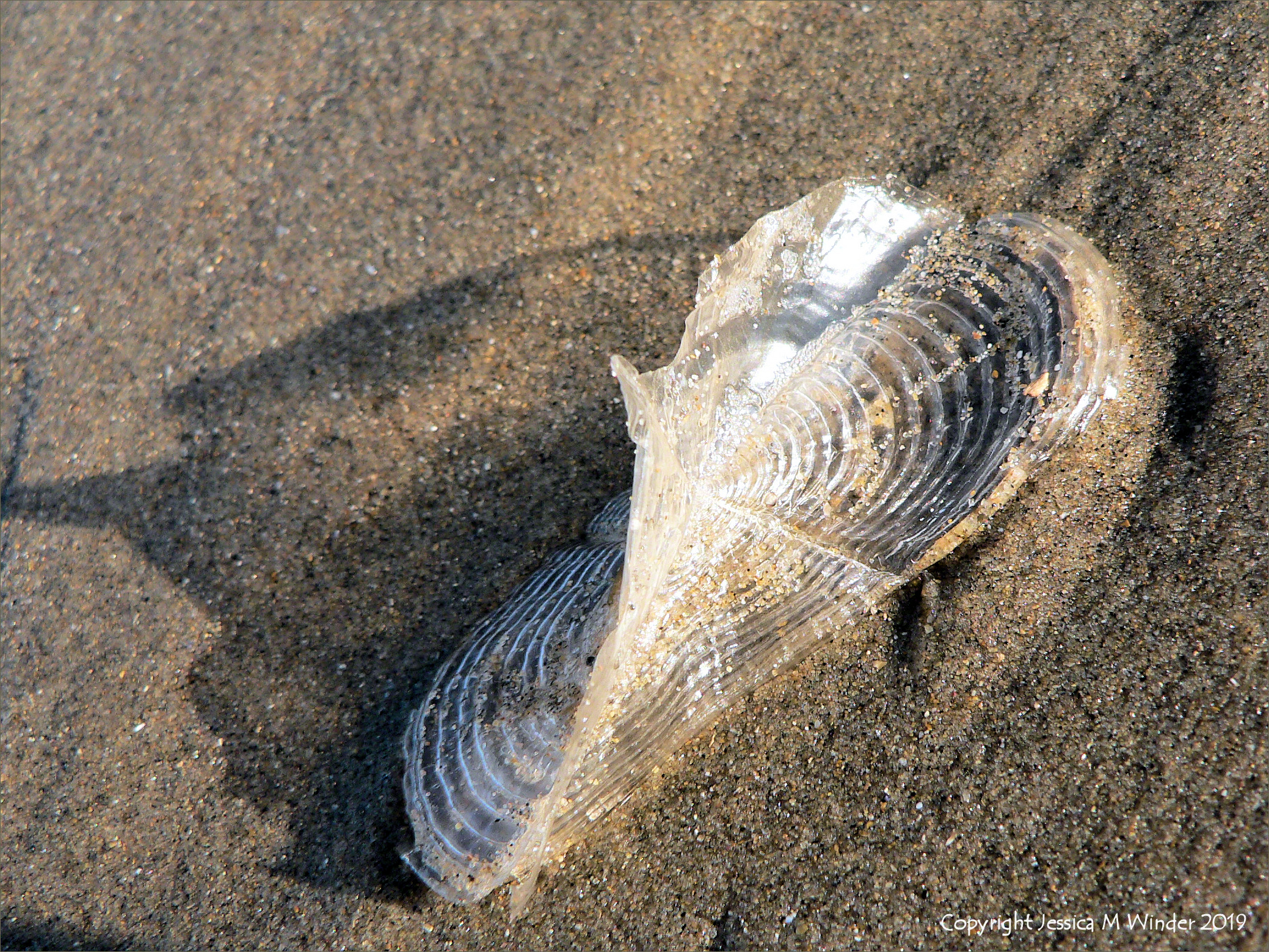 Velella velella chitinous float washed up on a sandy beach with the sail structure casting a shadow on the shore making it look like the small boat which appearance gives rise to its common name of “by-the-wind-sailor” P1040668