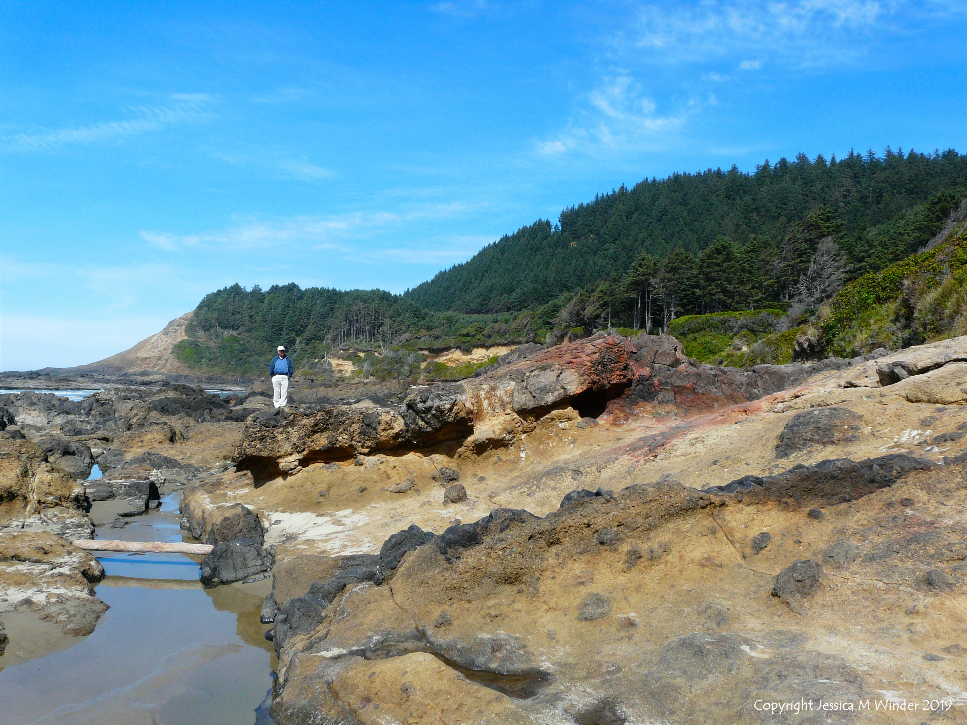 Wave-Cut Platform at Strawberry Hill 5 – Remnants of a wave-cut platform of mostly fragmental basalt on the Oregon Coast, dissected by linear dikes of darker and more uniform basalt.