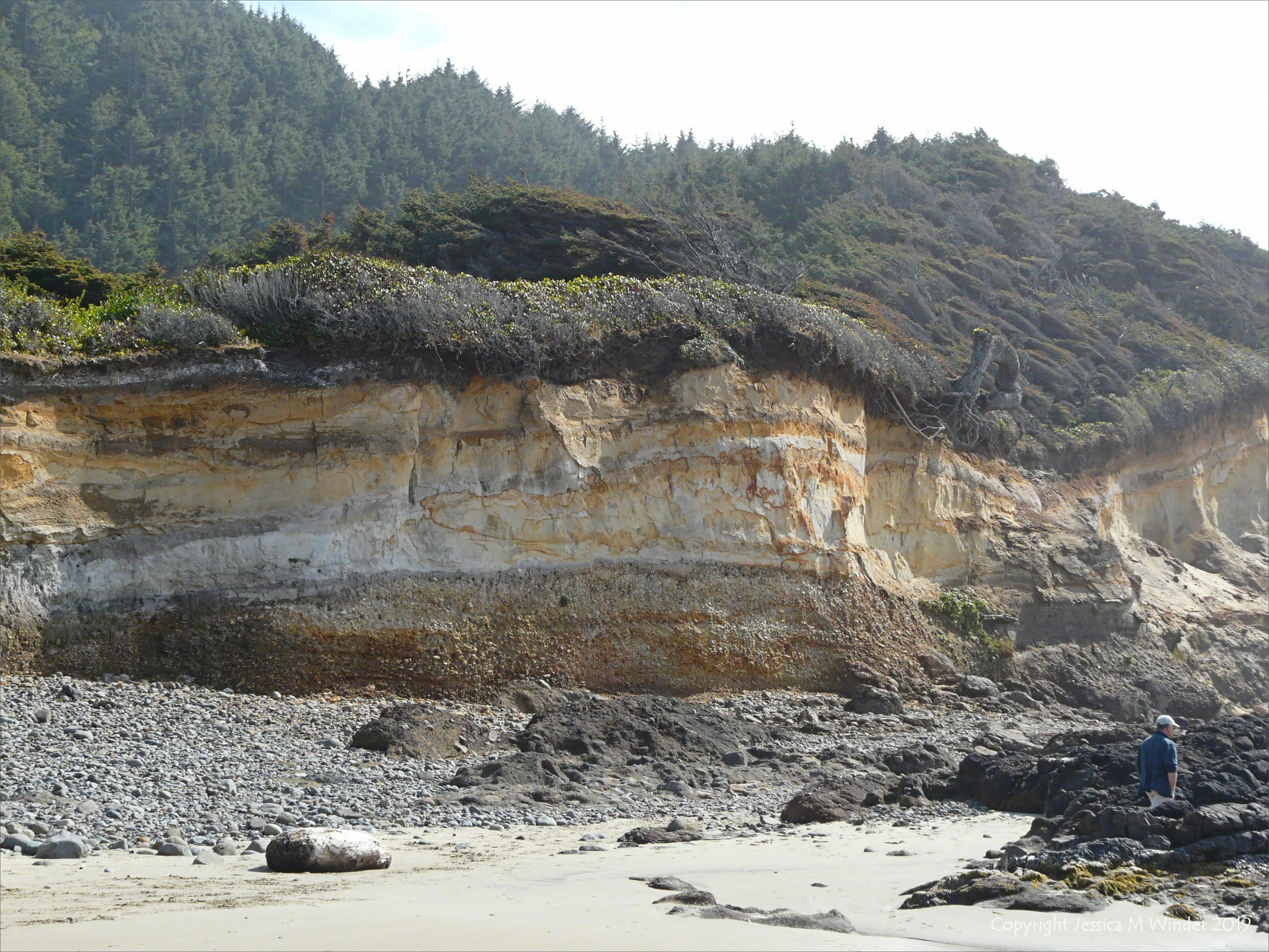 Raised Beach Deposits at Neptune State Park 3 – Sea cliff of terrace material comprising pebble conglomerate and sandstone above a wave-cut basalt bench on the shore of the Pacific Ocean coast in Oregon, USA.
