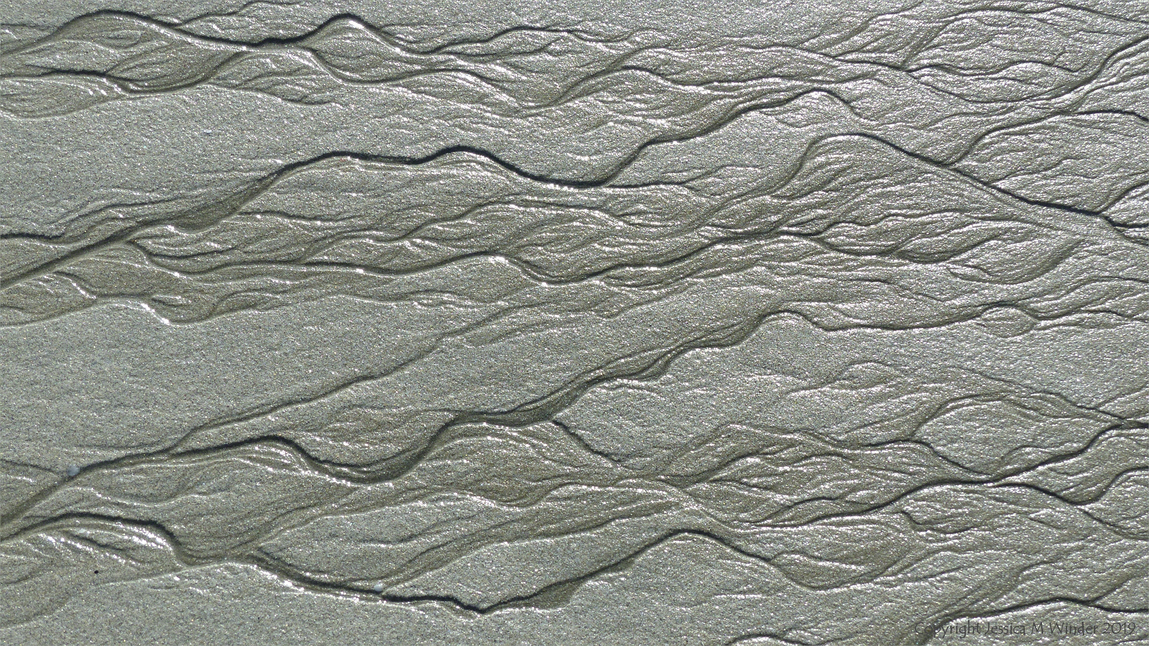 Natural dendritic drainage patterns in sand on the beach left by the outgoing tide at Braye in Alderney, Channel islands, October 2019.