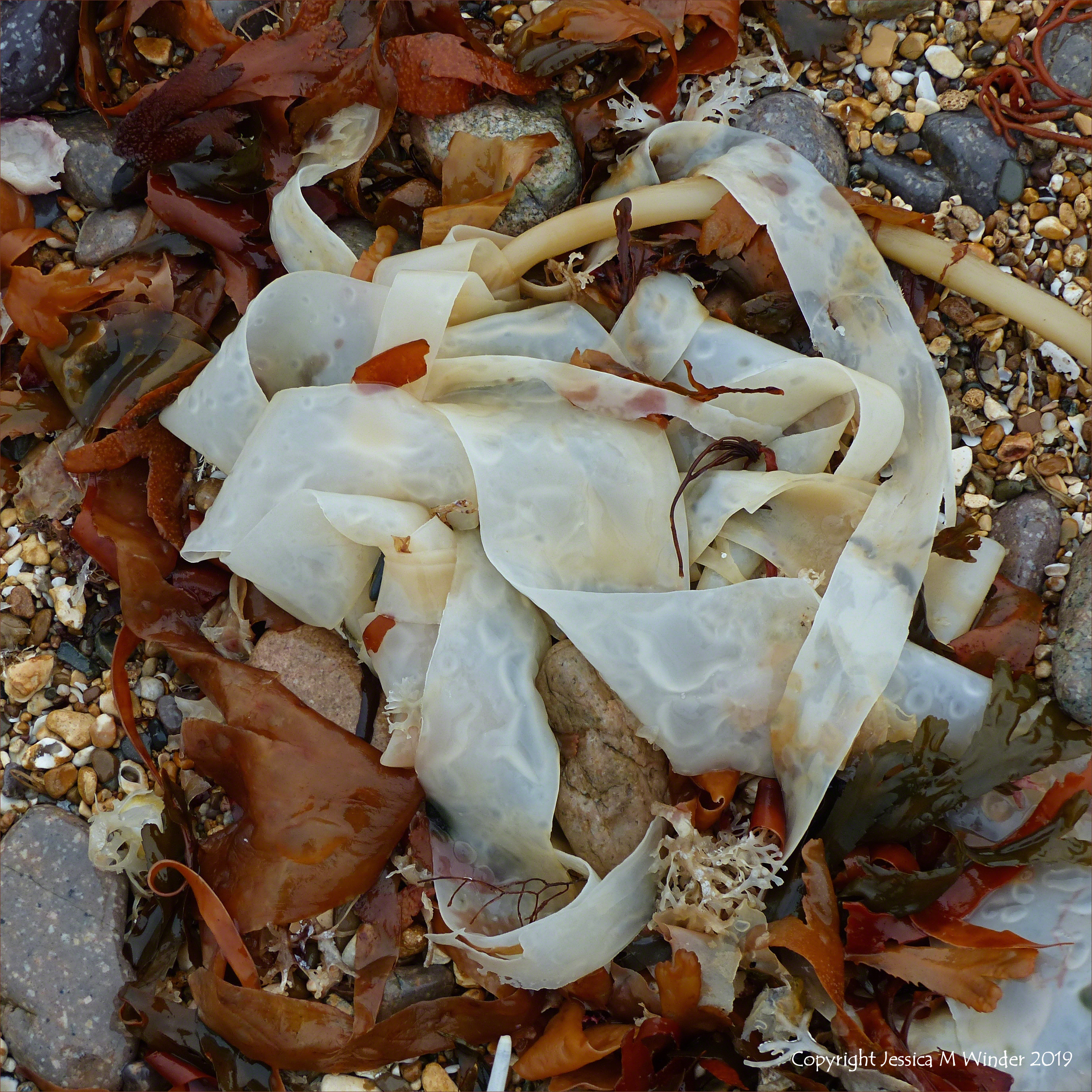 Multicoloured seaweeds on the strandline of the gravel beach at Platte Saline on Alderney in the Channel islands, October 2019.