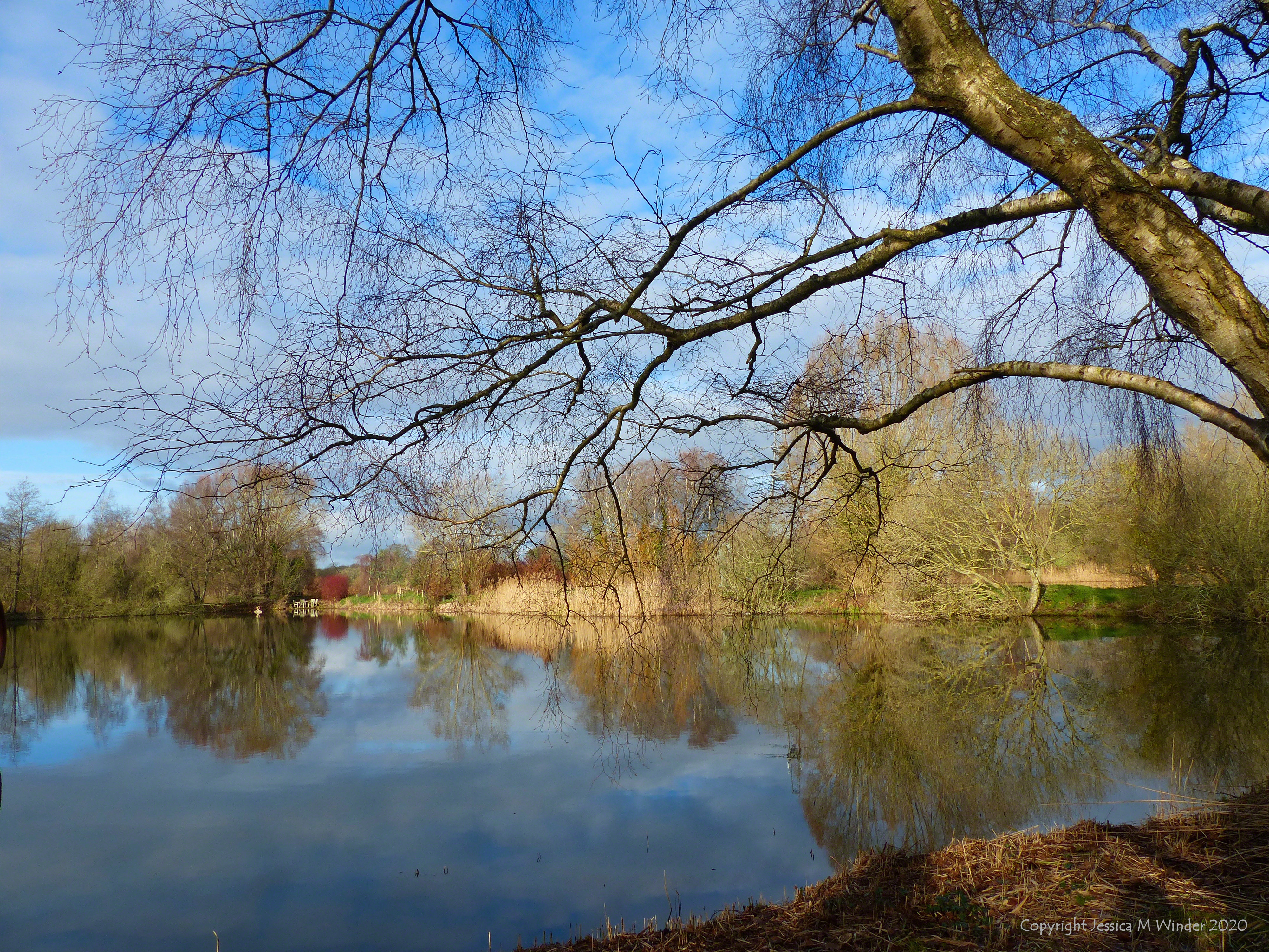 Sculpture By The Lakes 2020 Jan 1 Winter lakeside reflections at Sculpture by the Lakes near Tincleton in Dorset.