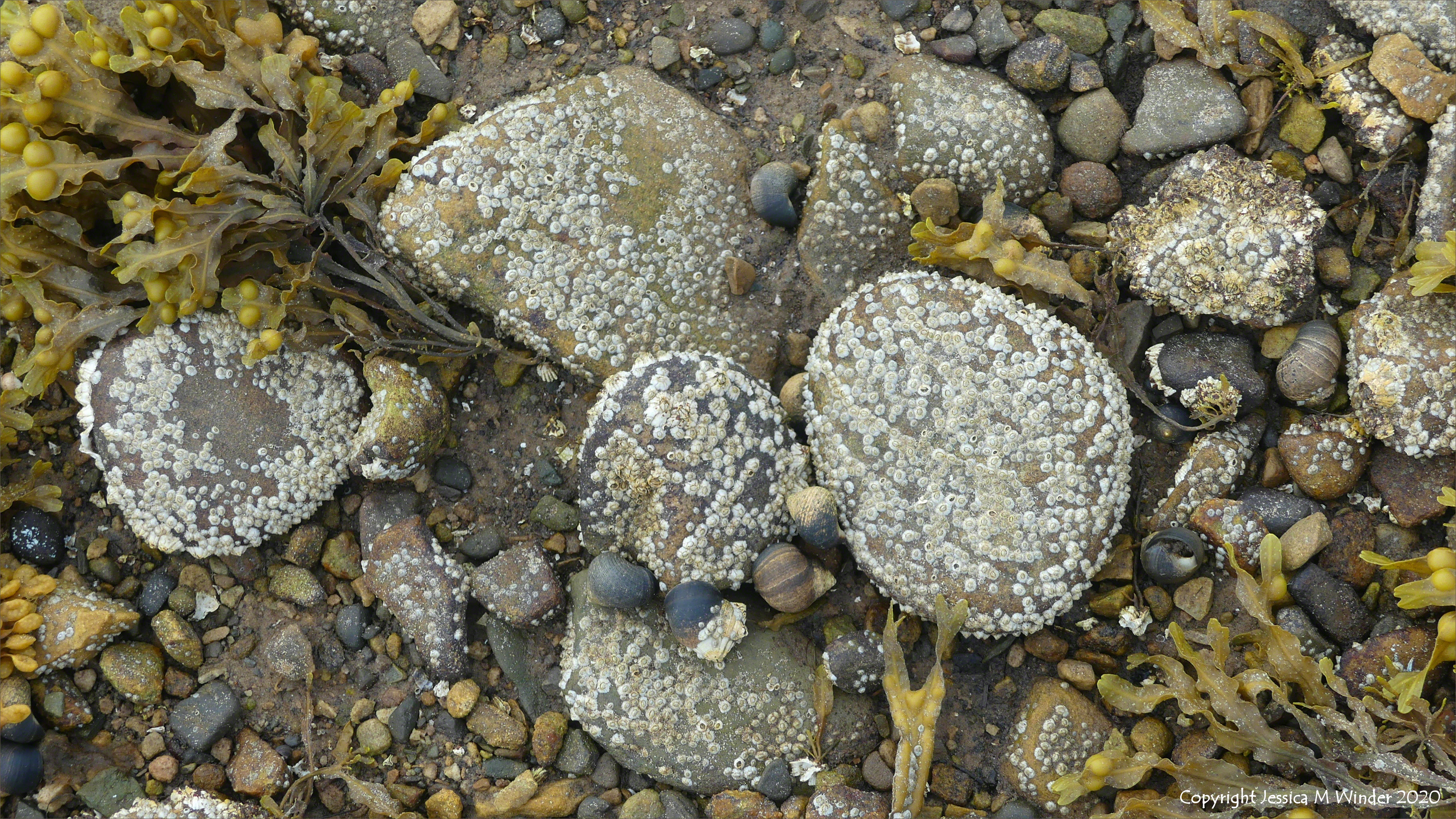 Barnacles and common periwinkles are virtually the only creatures growing on beach stones and pebbles on the seashore at Waulkmill Bay on Mainland Orkney, June 2018.