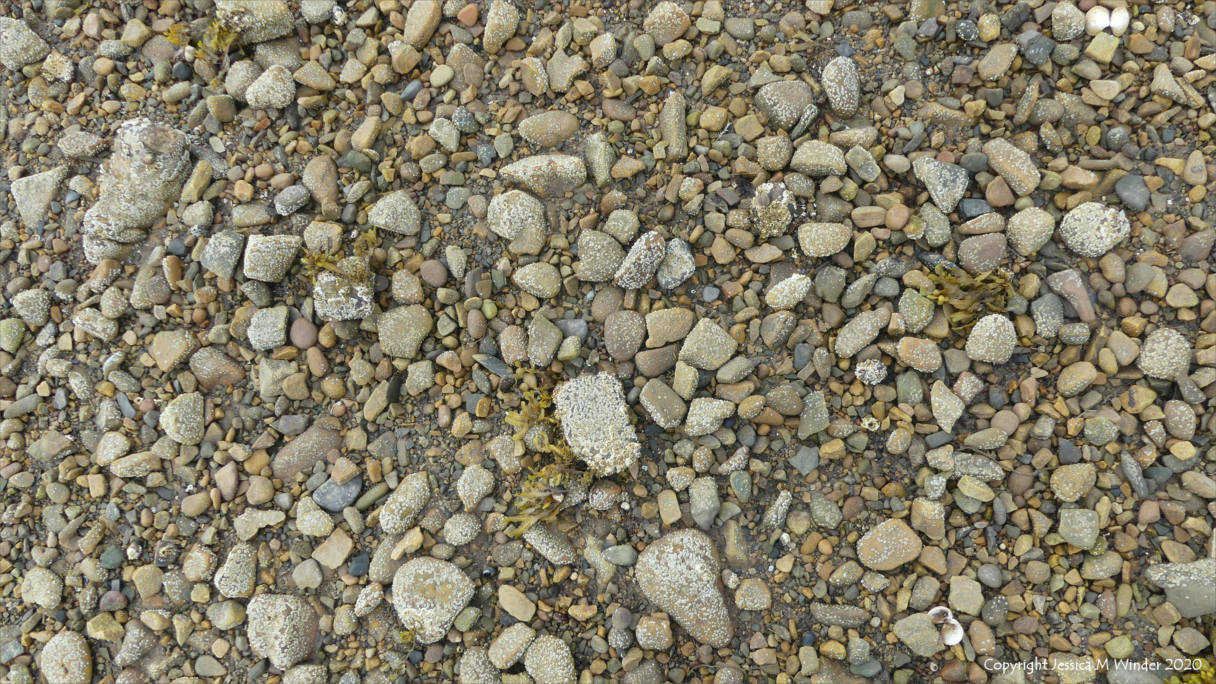 Barnacles and common periwinkles are virtually the only creatures growing on beach stones and pebbles on the seashore at Waulkmill Bay on Mainland Orkney, June 2018.