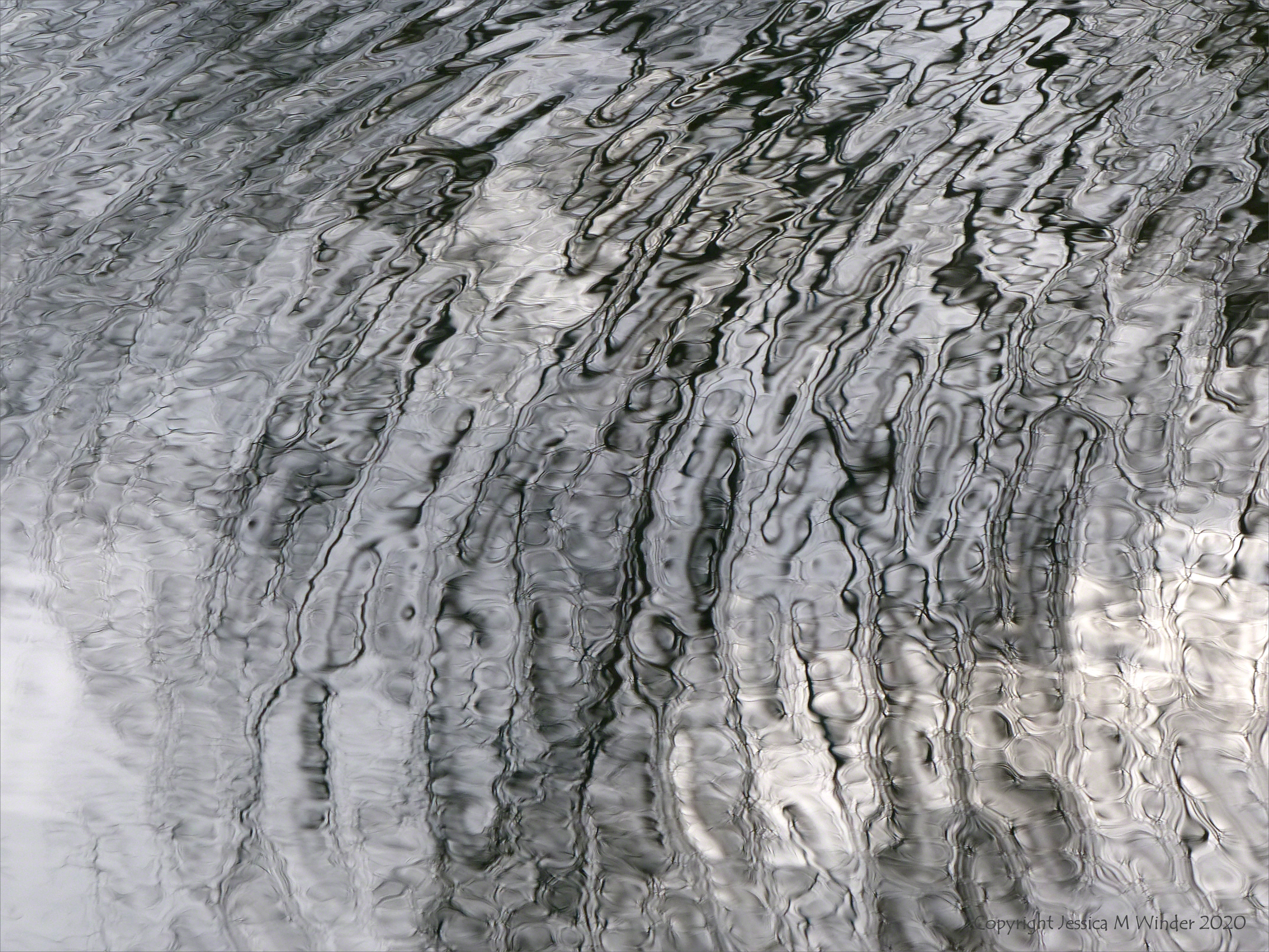 Quivering natural patterns of bare winter trees reflected on the water of the pool by The Retreat at Sculpture by the Lakes in Dorset, January 2020.