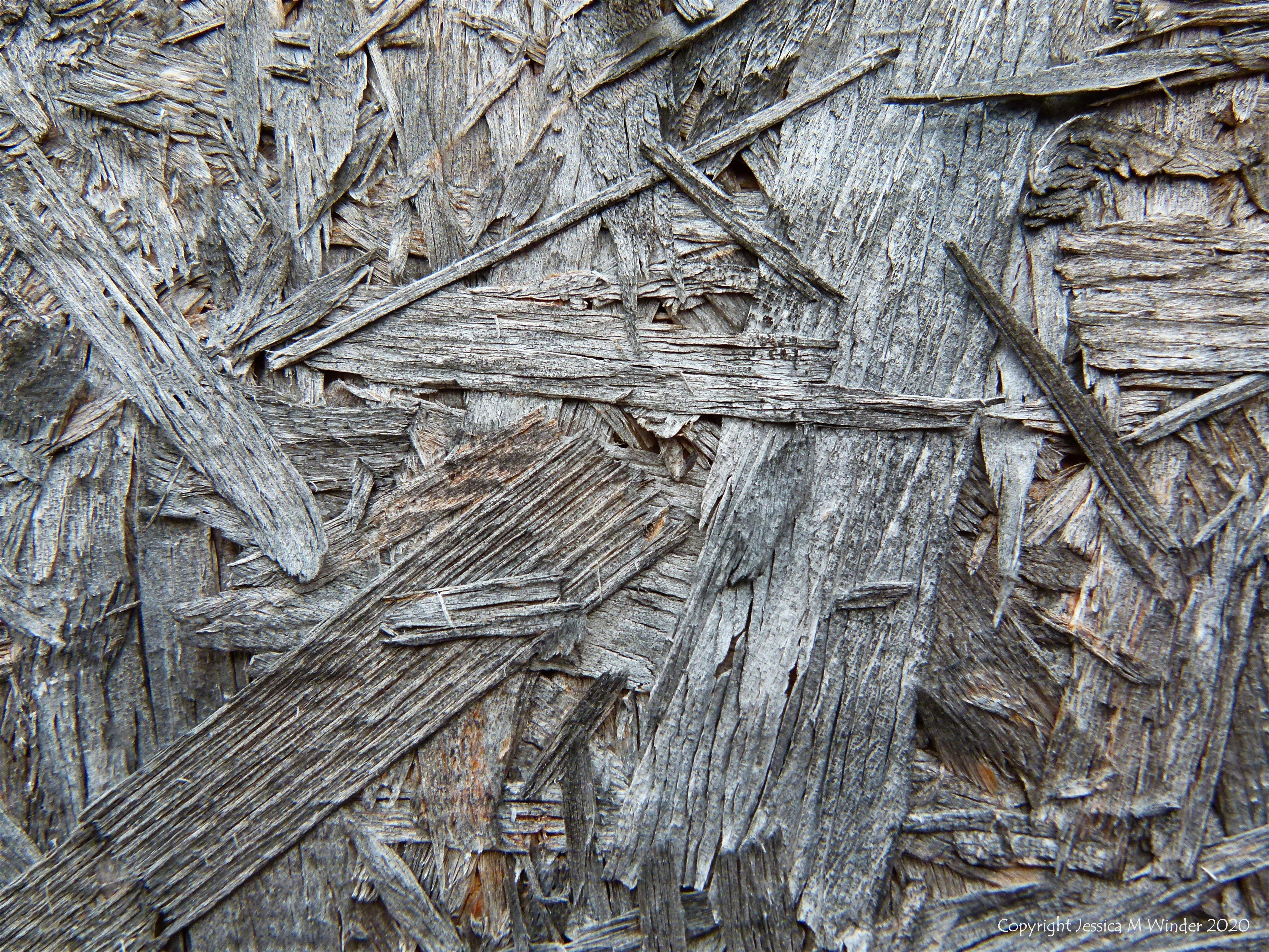 Branksome Wood Texture 1 Detail of weathered chipboard used to board up seaside beach huts out of season at Branksome in Dorset.