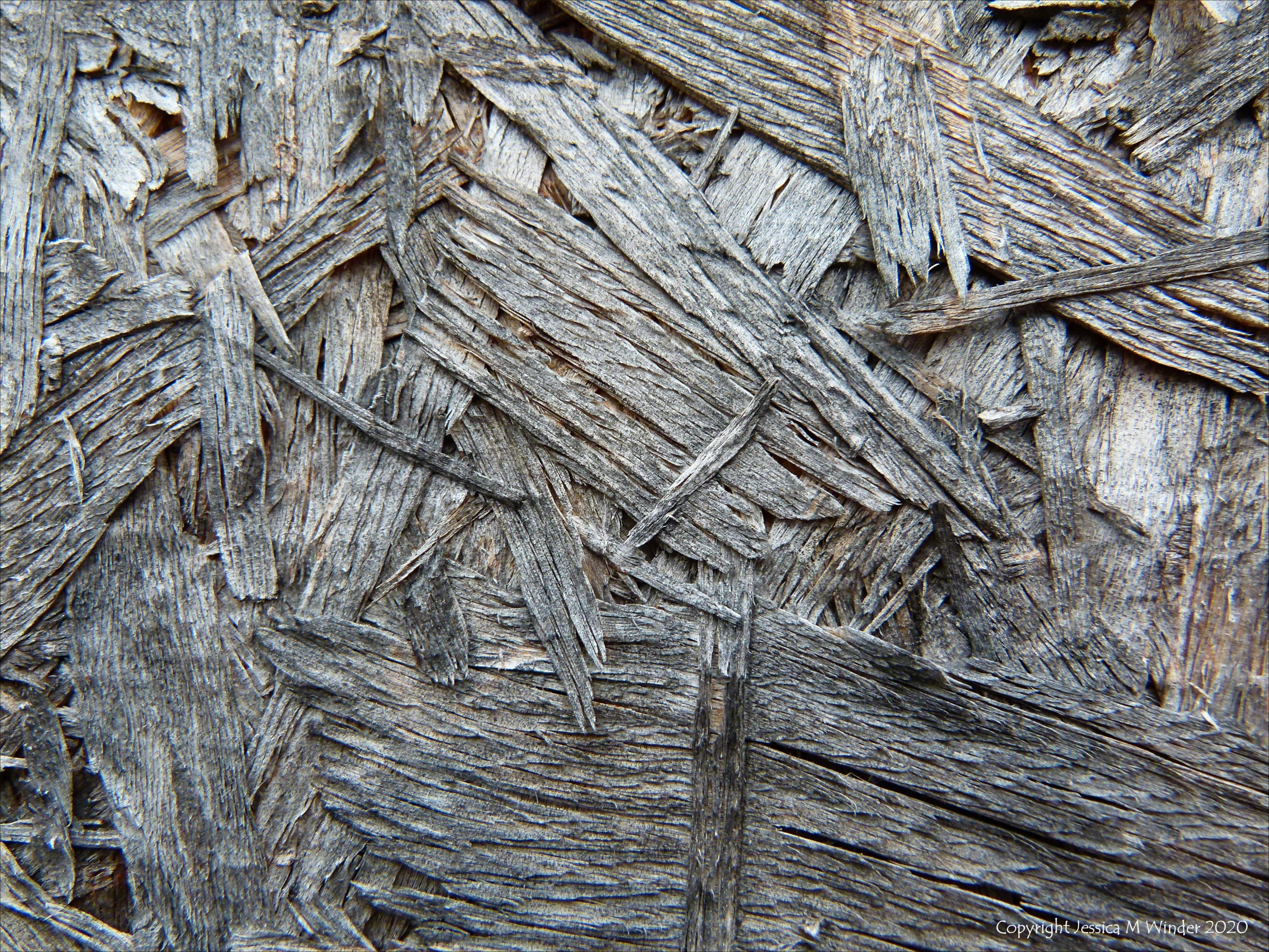 Branksome Wood Texture 3 Detail of weathered chipboard used to board up seaside beach huts out of season at Branksome in Dorset.