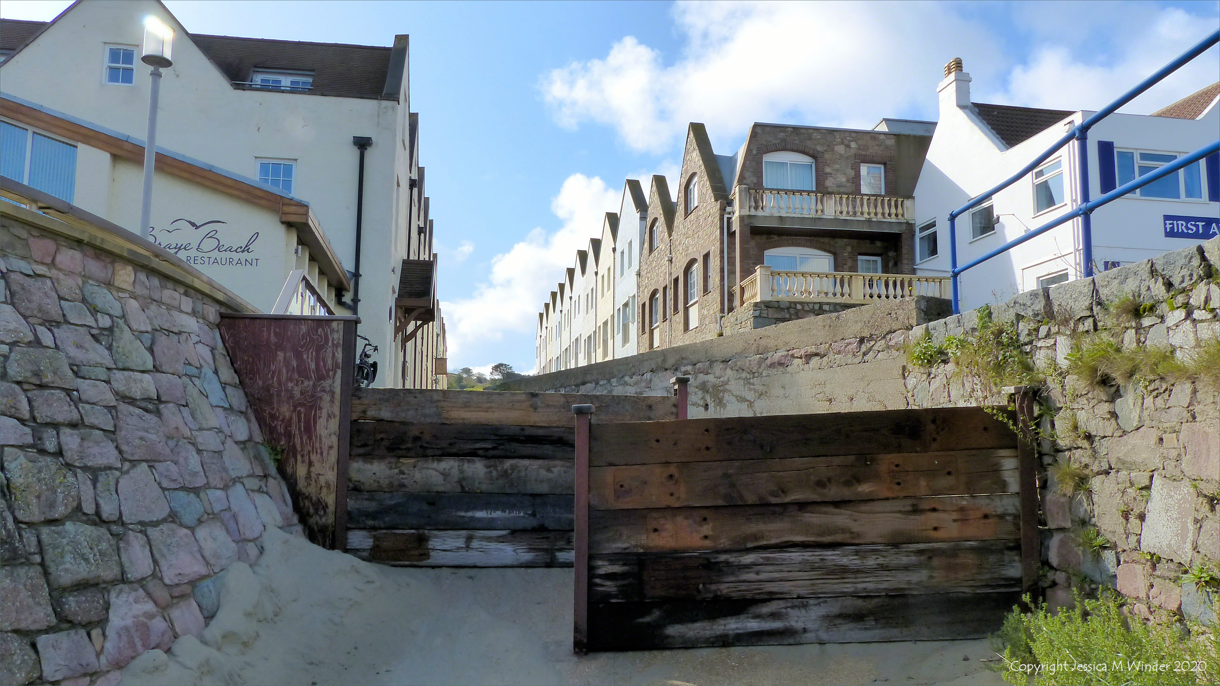 Recycled railway sleepers used as a barrier to stop sand migrating from the shore to the street at Braye Beach in the Channel Island of Alderney