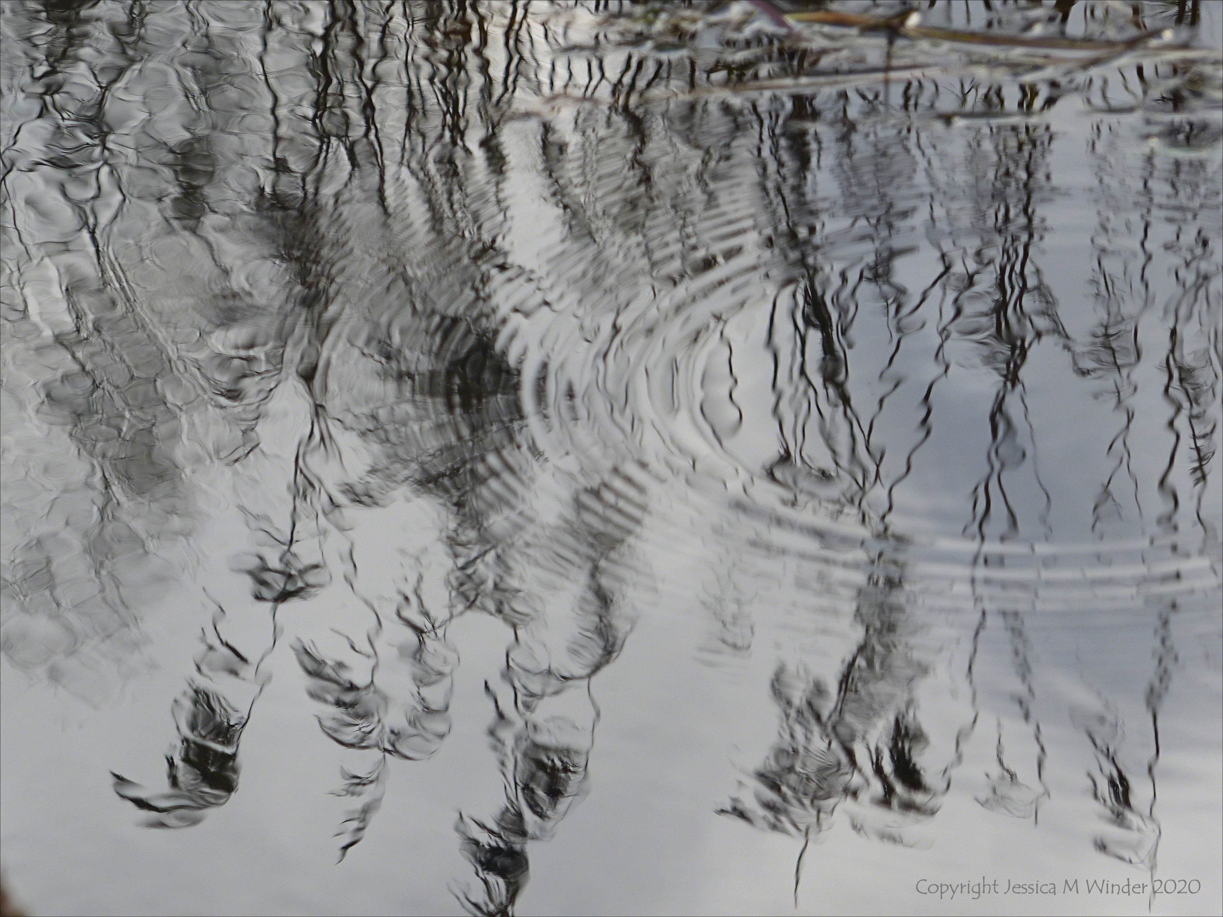 Reflections of reeds on water in a still pond by The Retreat at Sculpture by the Lakes in Pallington, Dorset, January 2020