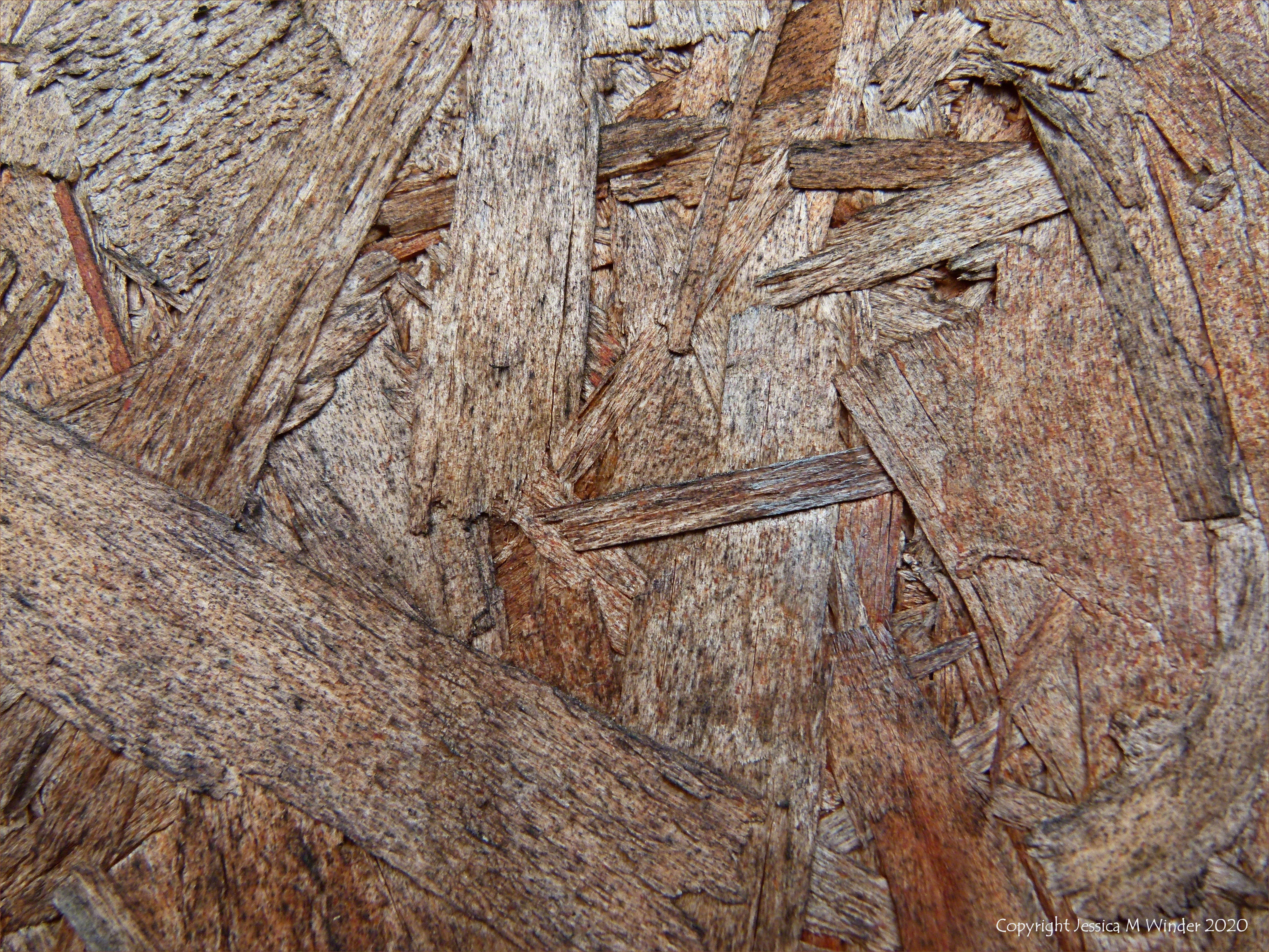 Branksome Wood Textures 14 Detail of weathered chipboard used to board up seaside beach huts out of season at Branksome in Dorset.