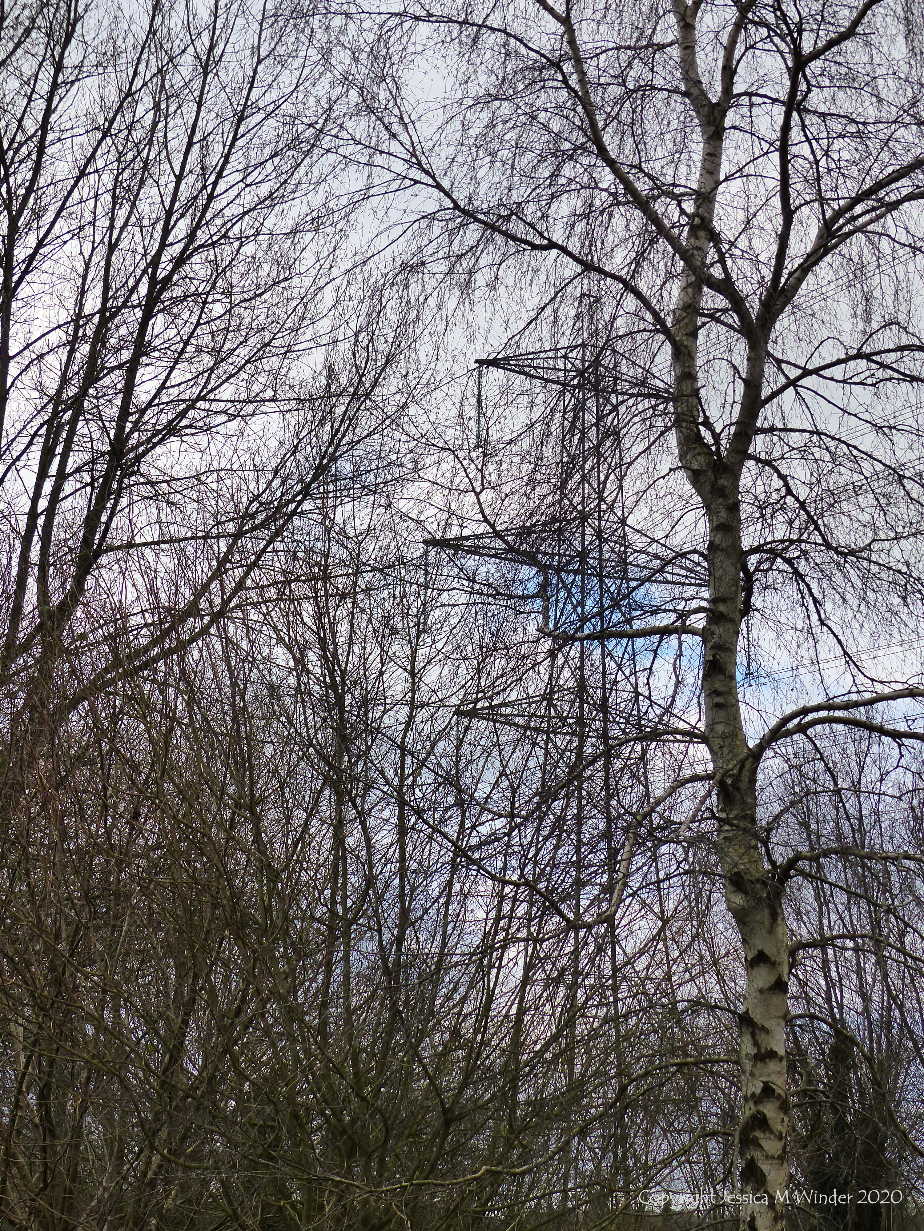 Natural network pattern of tree branches and twigs with manmade metal pylon with network of girders at Sculpture by the Lakes in Dorset January 2020.