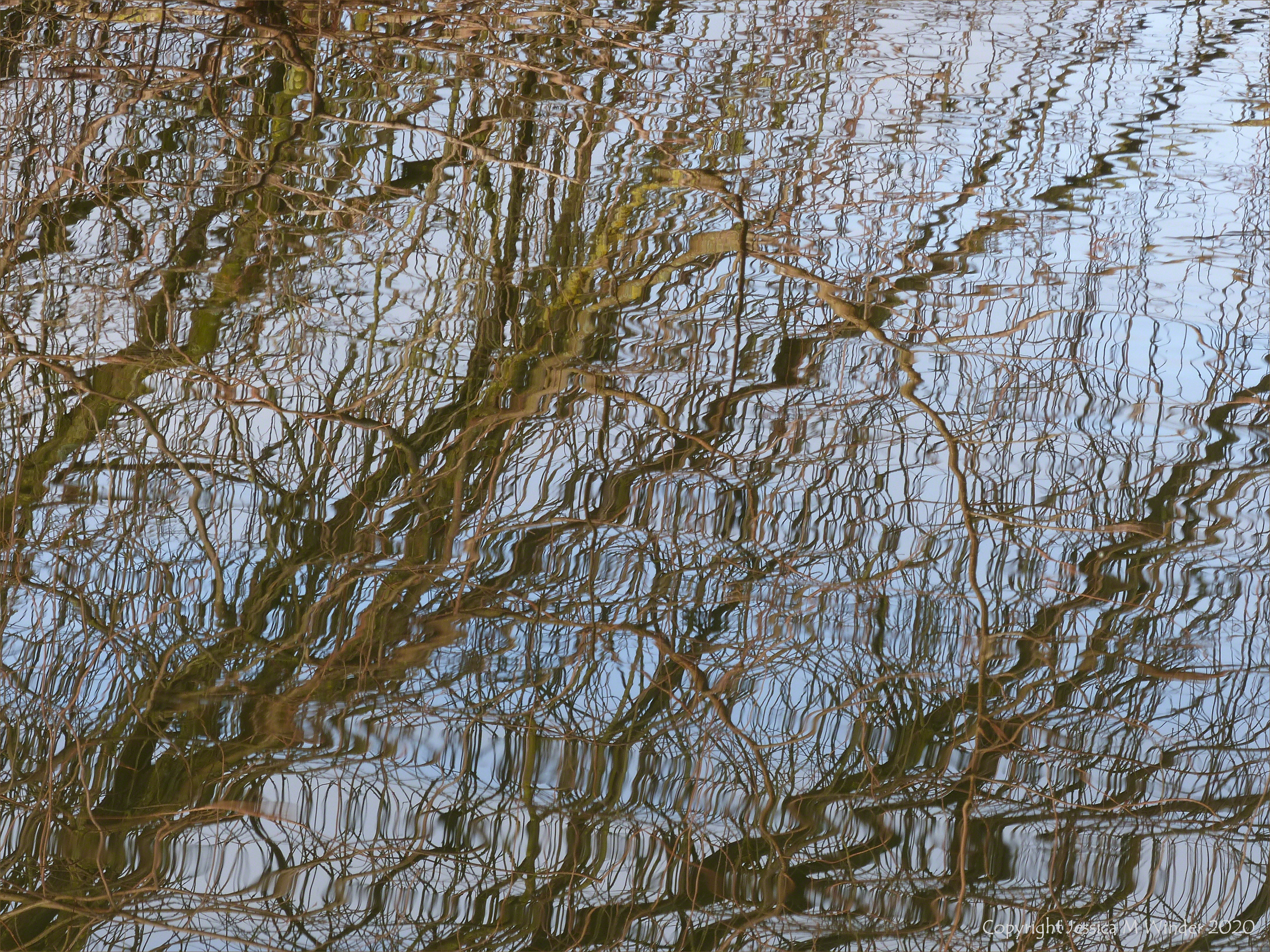 The disturbed watery reflections of lakeside branches form colourful mosaic-like patterns at Sculpture by the Lakes in January 2020