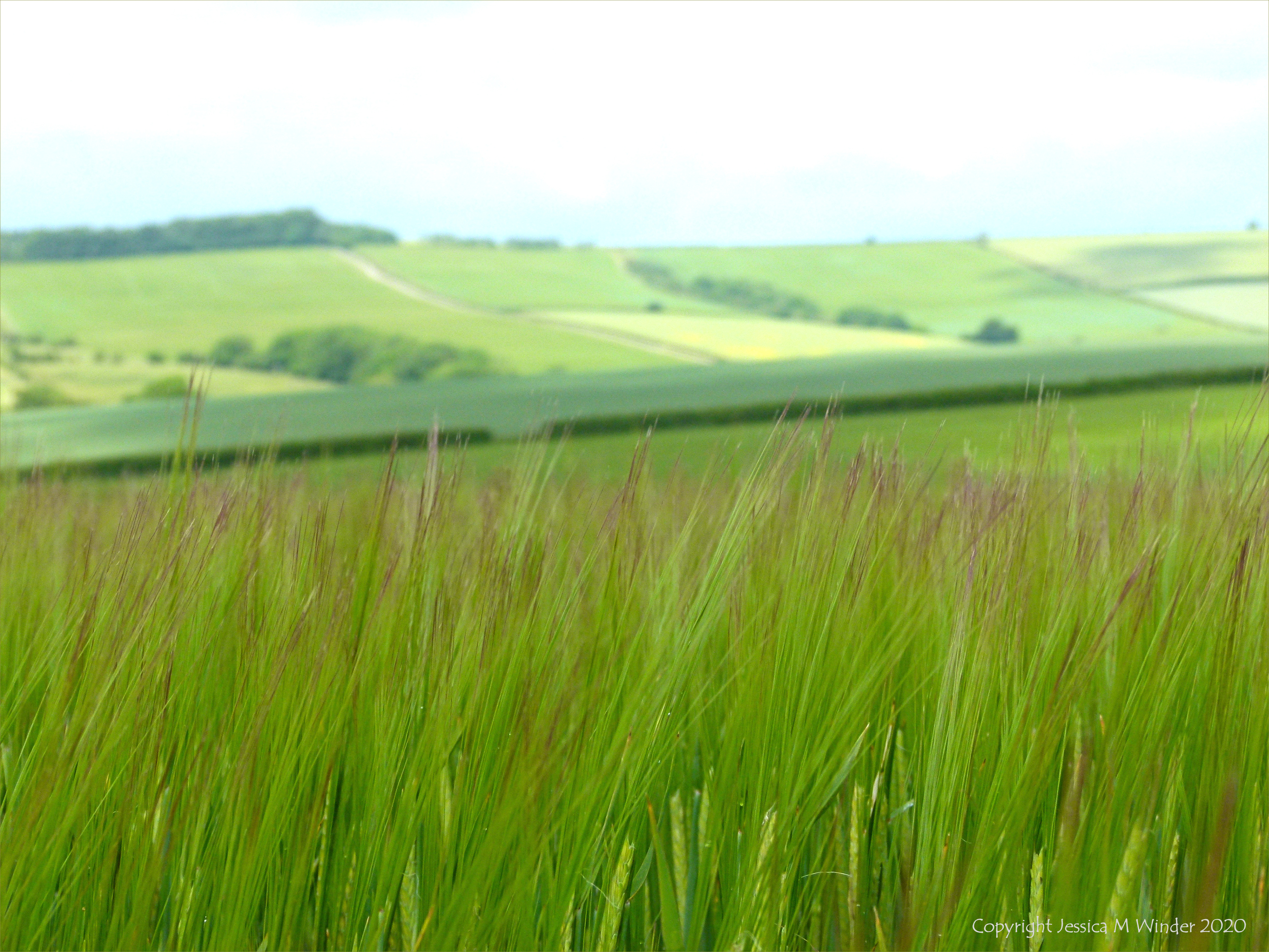 Landscape with field of ripening barley in foreground.