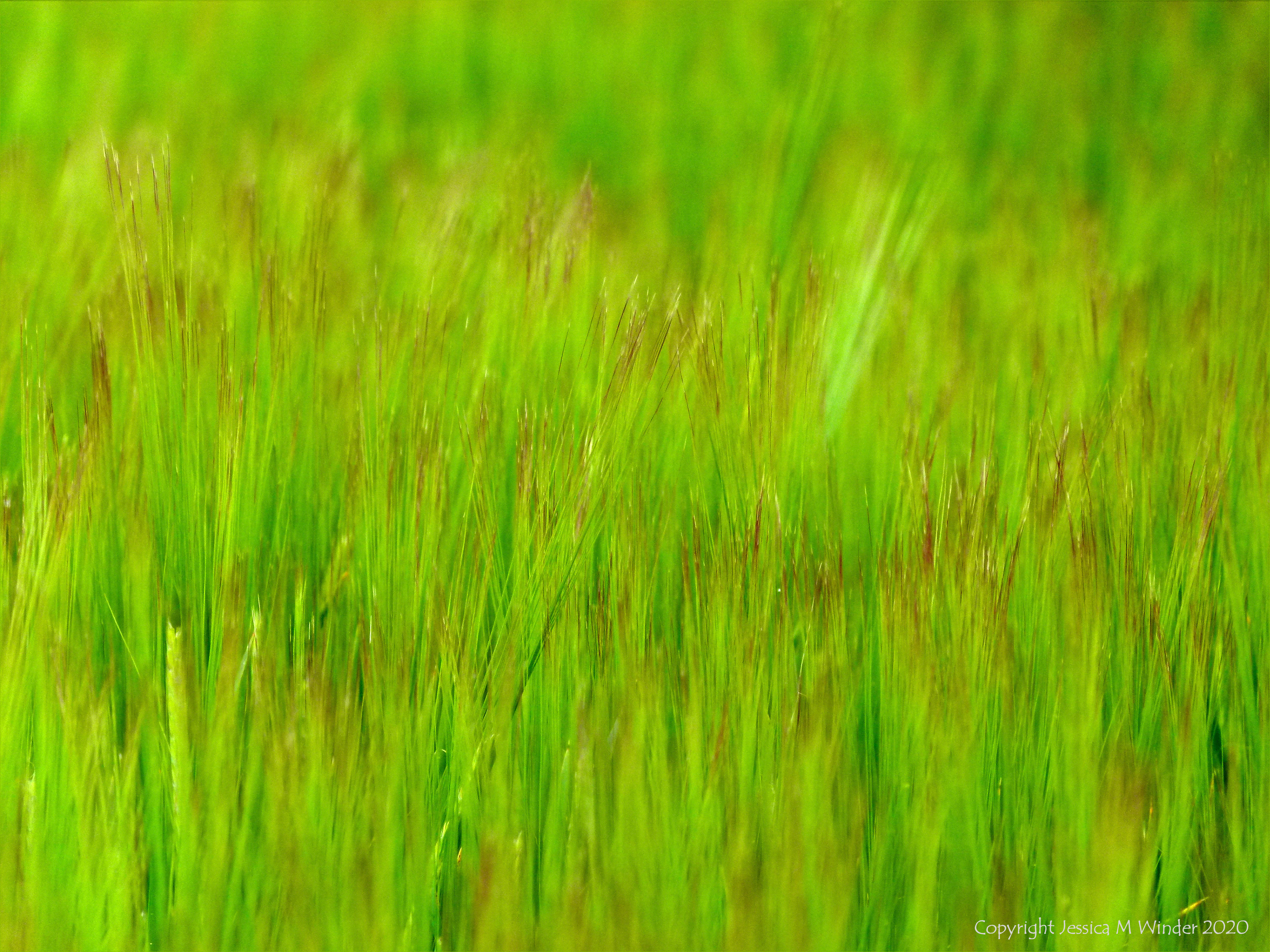 Close-up of the moving stems and tinted seed spikes of ripening barley in a field on the top of Charlton Down in Dorset.