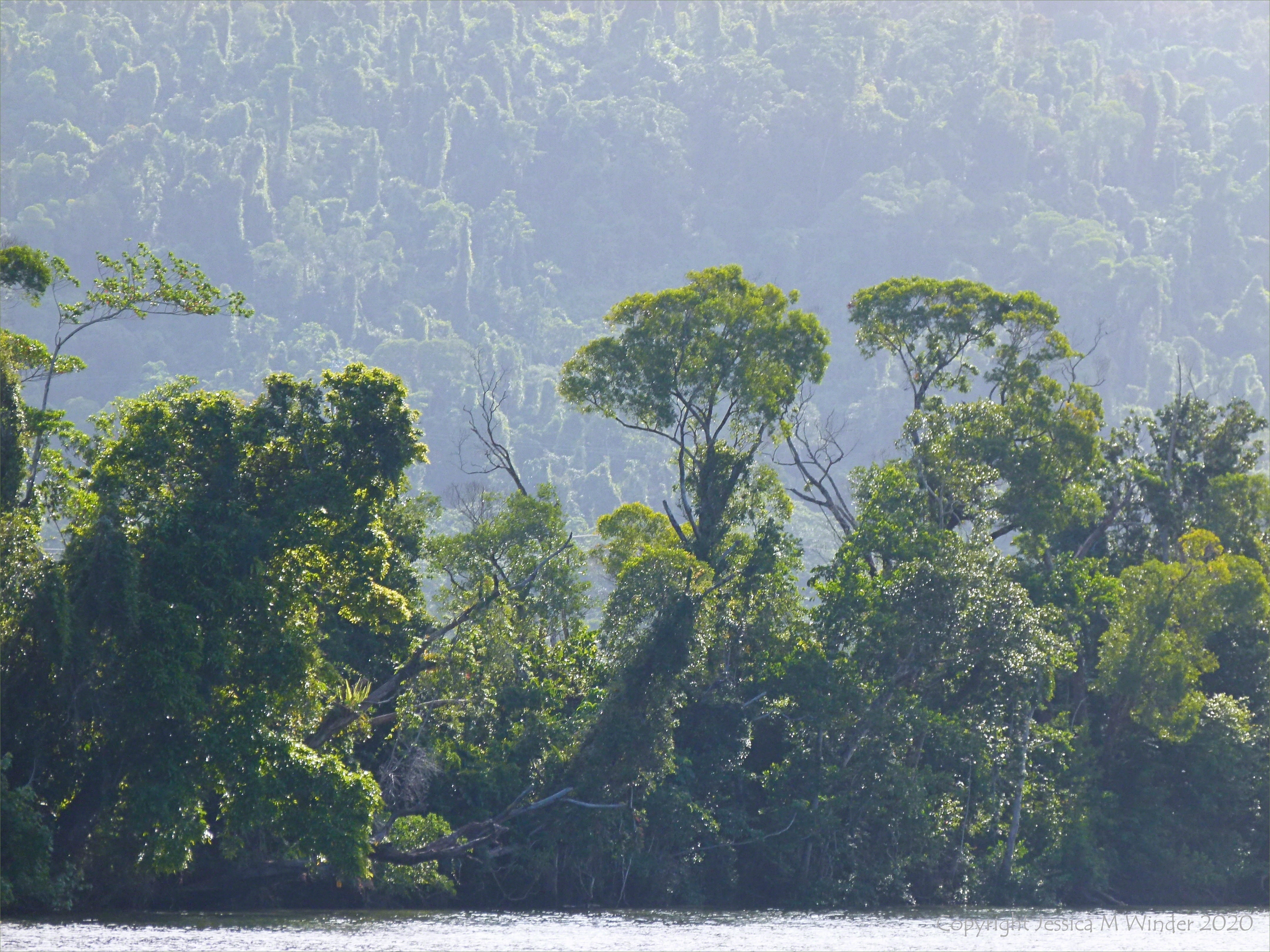 Evening view of the mangroves on the bankside of the Mulgrave River with tree-clad hills of tropical rain forest shrouded in haze in the background.