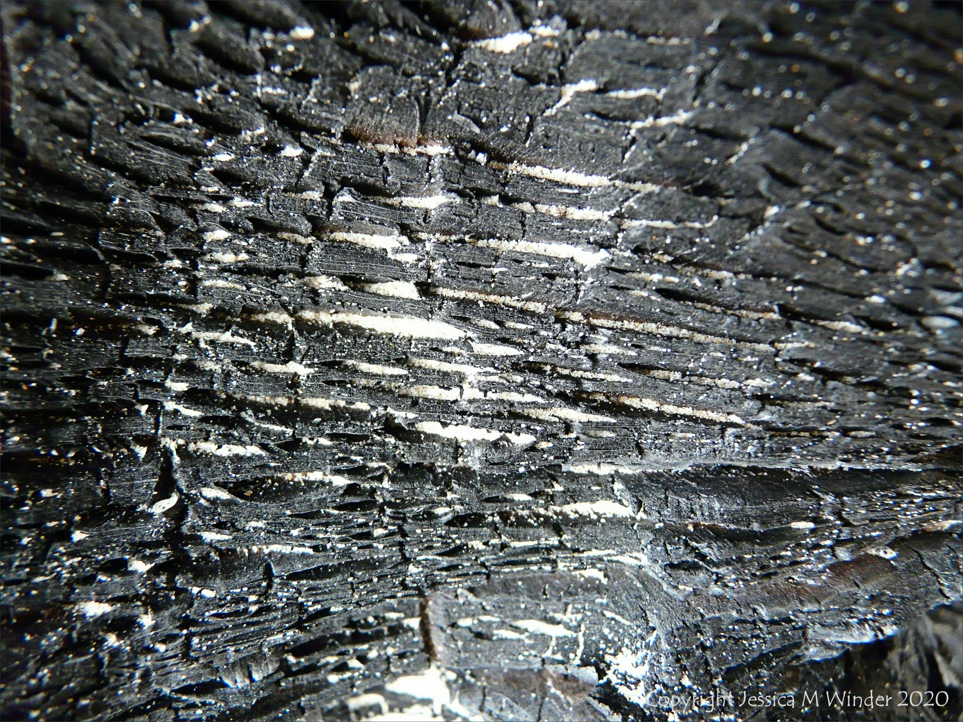 Close-up detail of woodgrain in burnt driftwood on a sandy beach