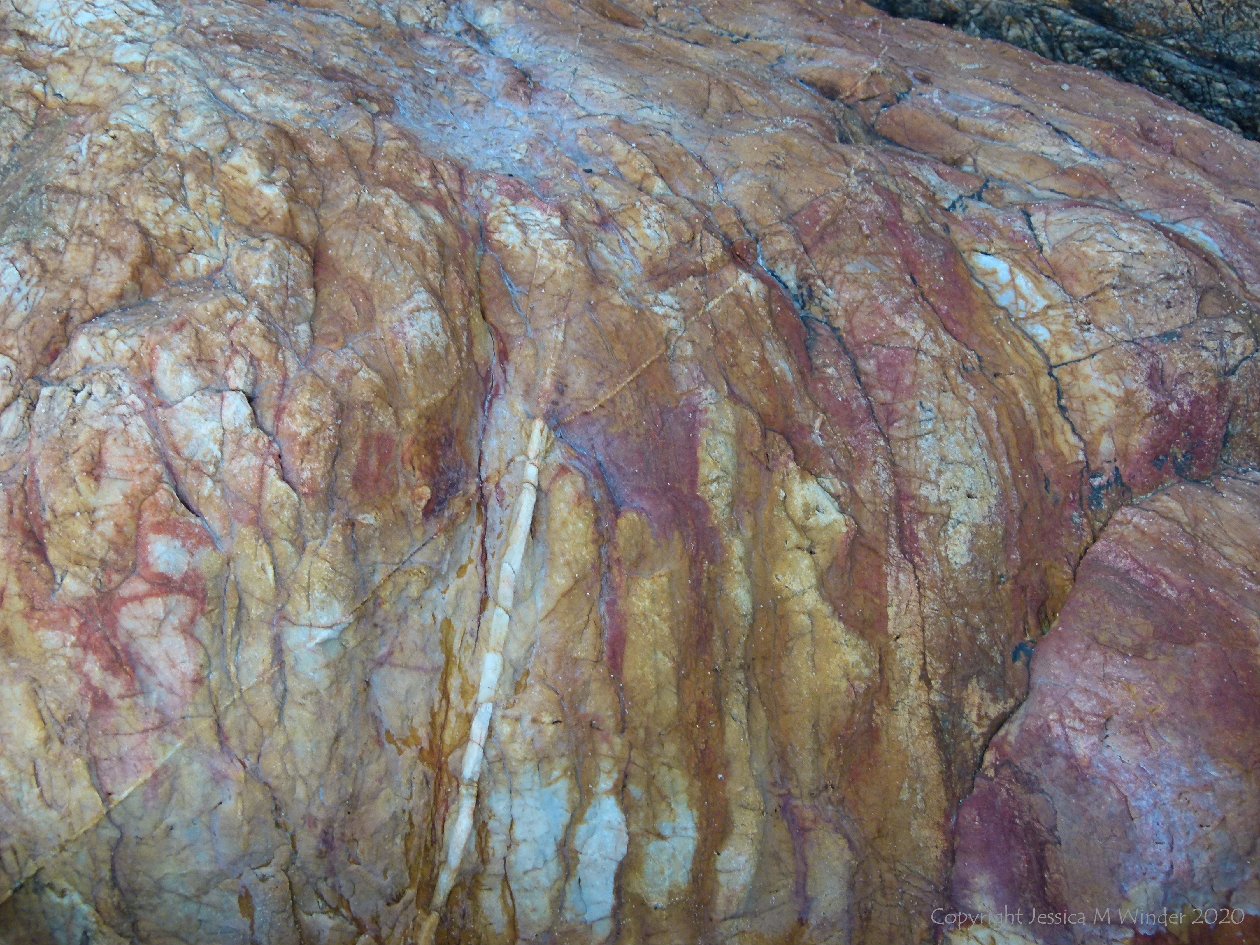 Close-up detail of natural abstract patterns on a boulder in rock armour or riprap protecting the shoreline at Trinity Beach in Queensland , Australia.