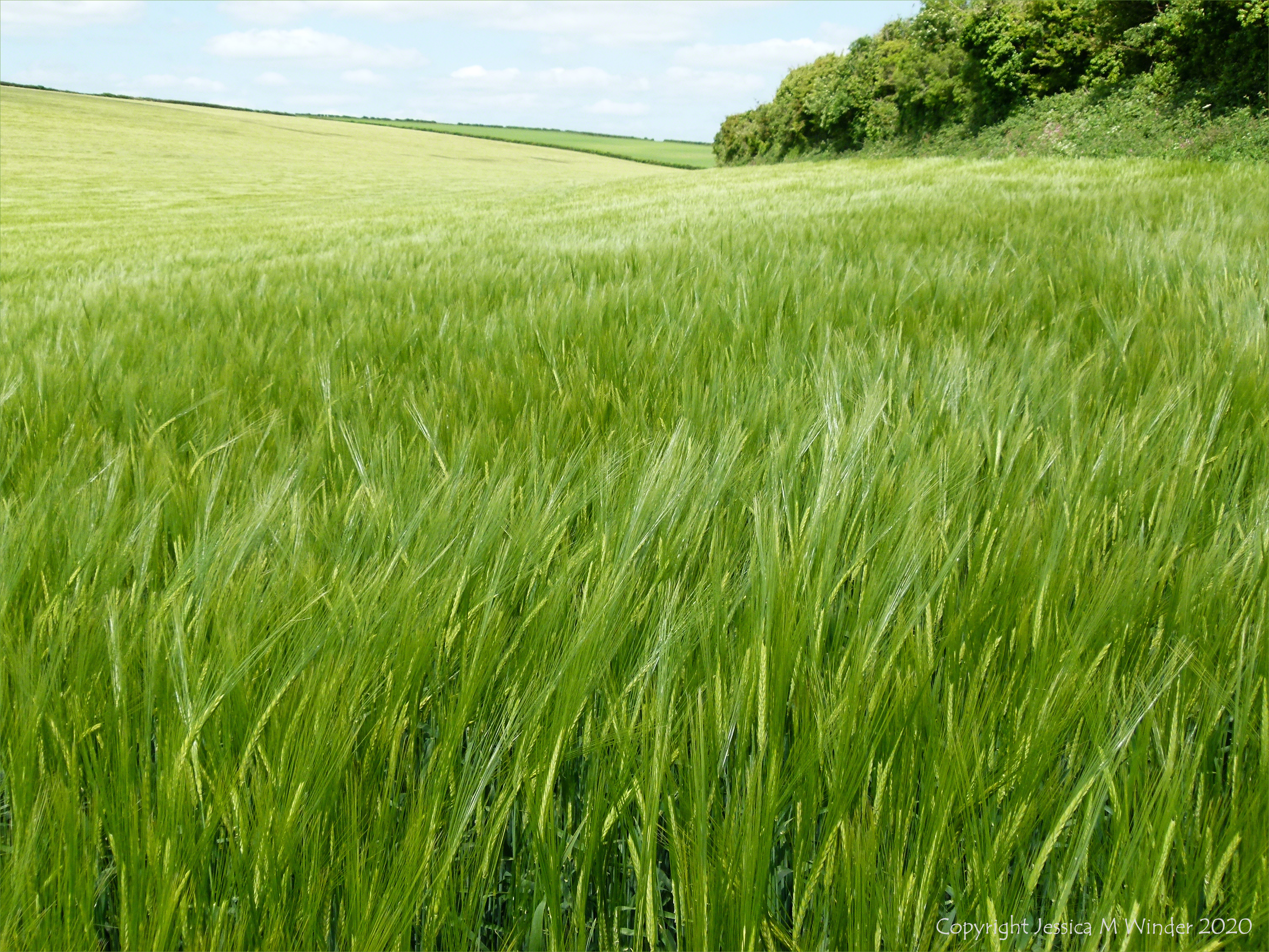 Barley Field Calm Day 1 Barley with spiked seed heads growing in the British countryside at Charlton Down in Dorset May 19 2011