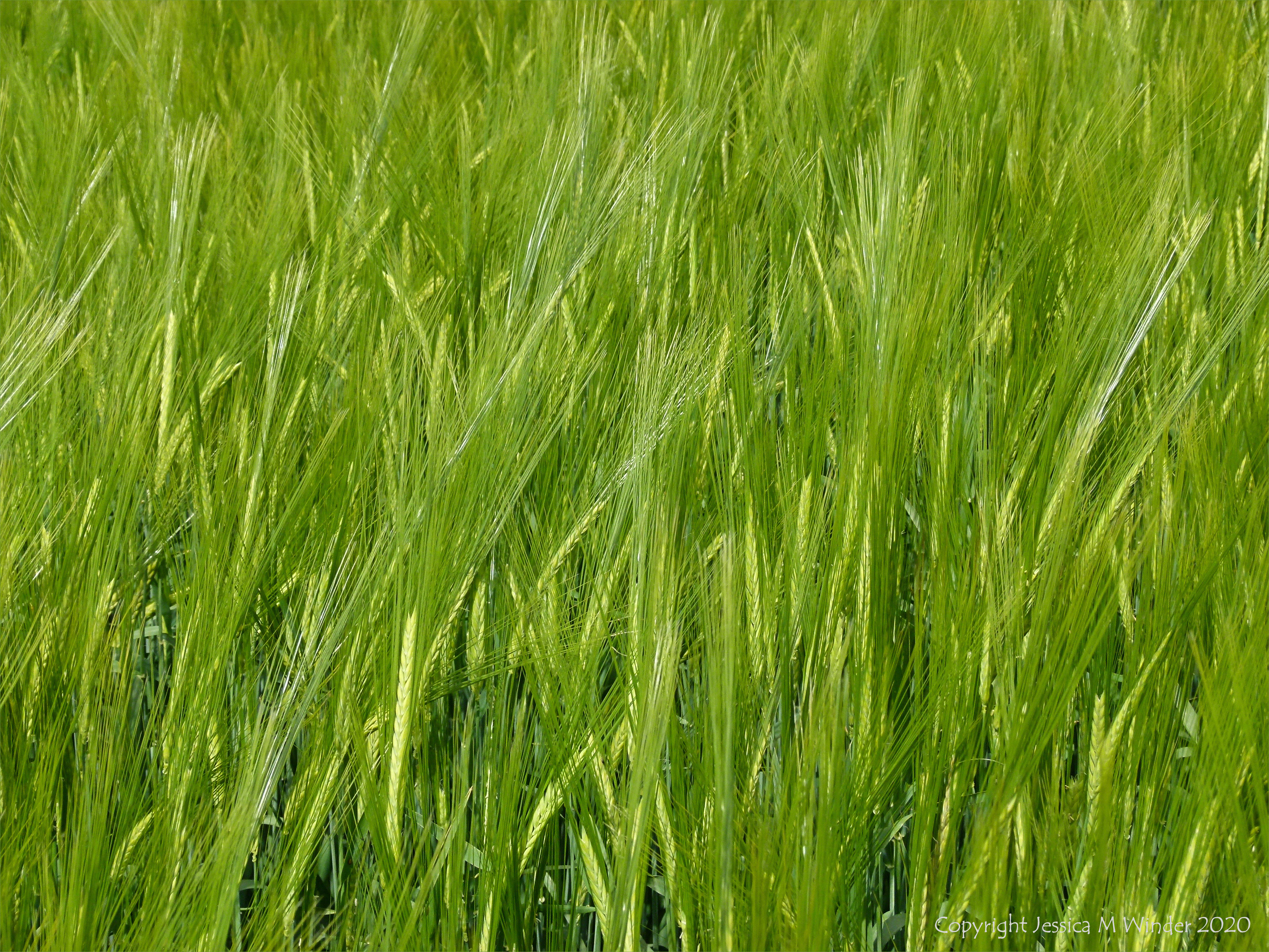 Barley Field Calm Day 3 Barley with spiked seed heads growing in the British countryside at Charlton Down in Dorset May 19 2011
