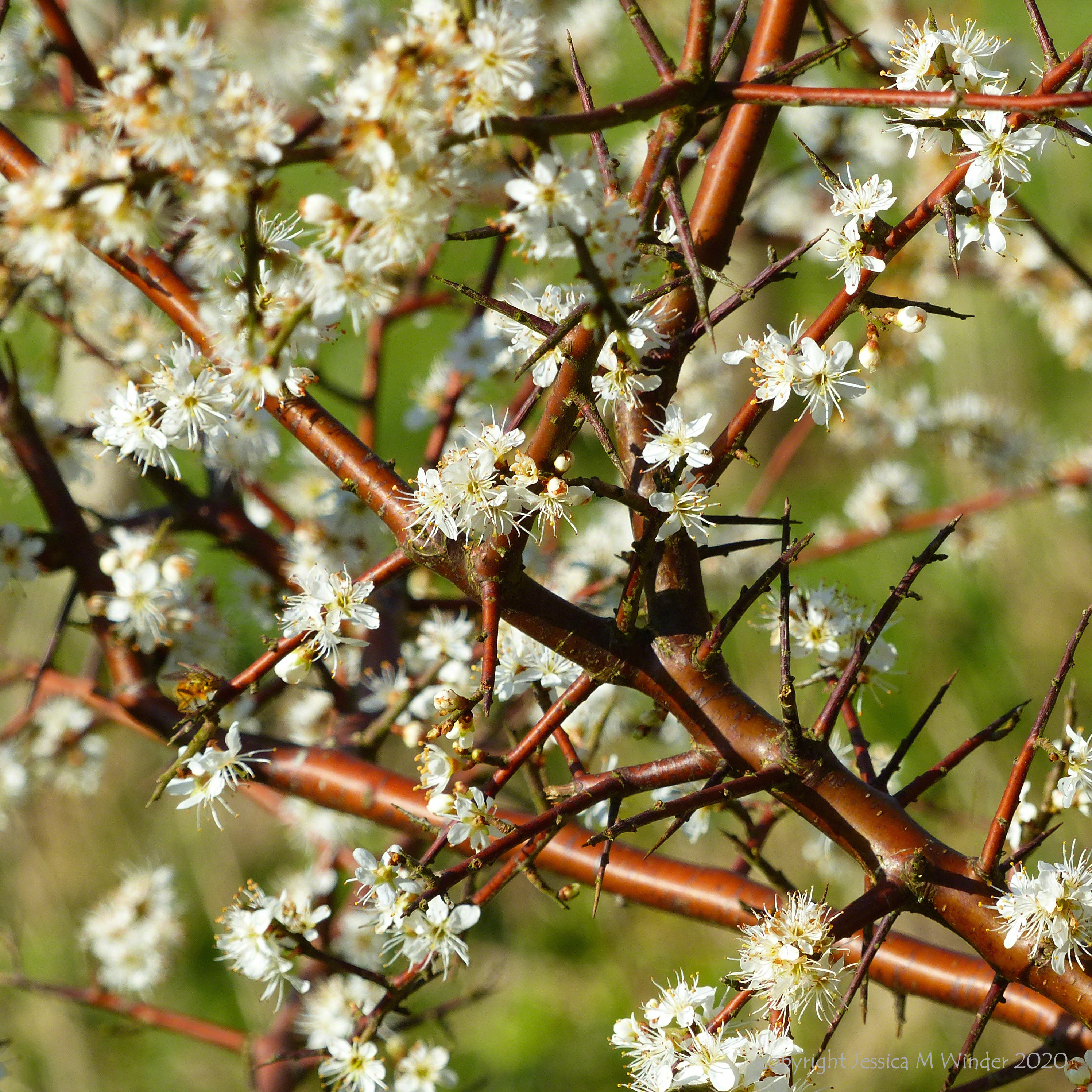 Delicate white flowers of Blackthorn (Prunus spinosa) are blossoming around the village as I go for my short daily walk around the village and brighten my day while staying at home because of the coronavirus.