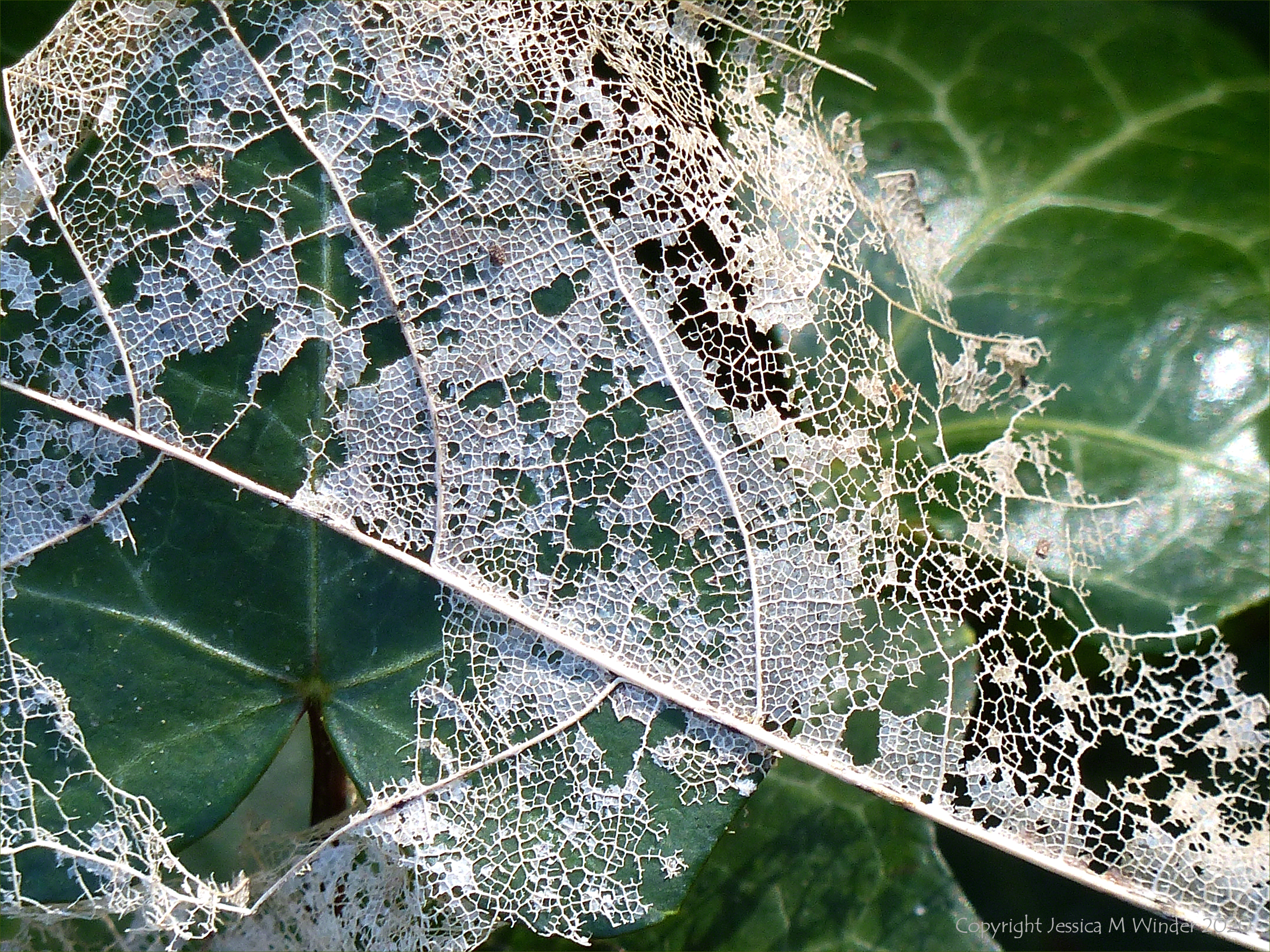 White lacy skeletonised leaves from last autumn covering groundcover ivy leaves this spring in Charlton Down village. Seen on my daily short excursion out of the house for fresh air, exercise, and spiritual uplift in these difficult times with the virus outbreak.