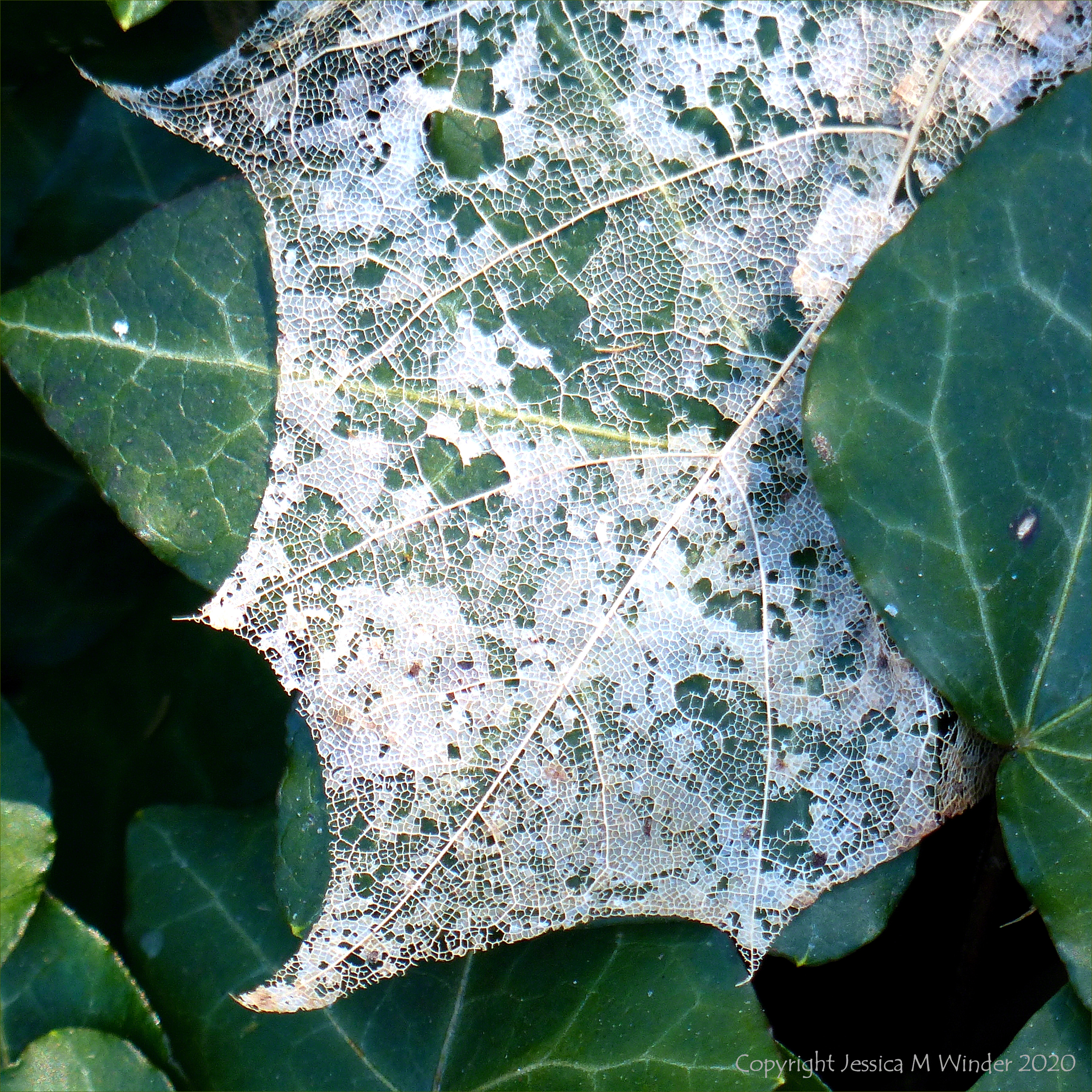 White lacy skeletonised leaves from last autumn covering groundcover ivy leaves this spring in Charlton Down village. Seen on my daily short excursion out of the house for fresh air, exercise, and spiritual uplift in these difficult times with the virus outbreak.