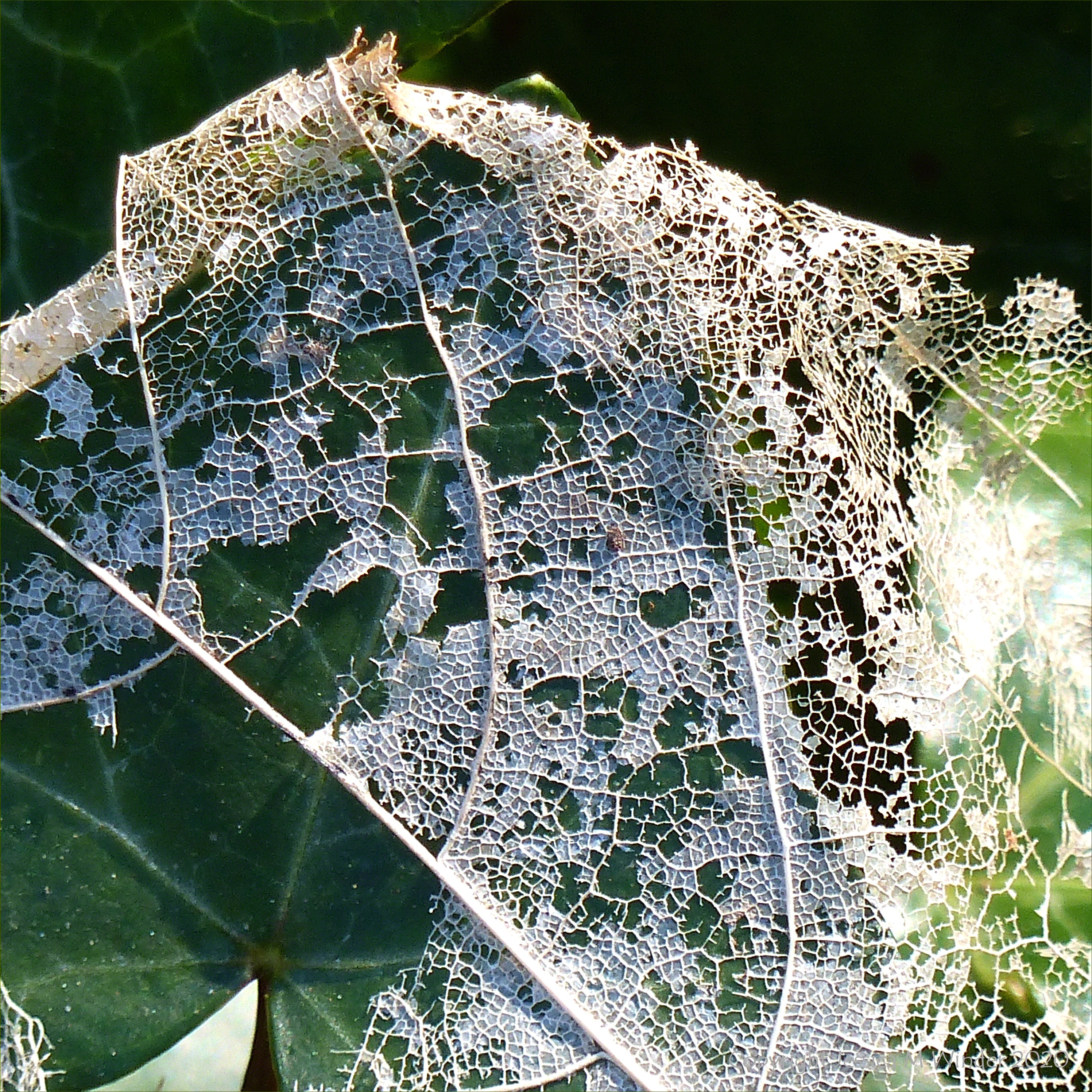 White lacy skeletonised leaves from last autumn covering groundcover ivy leaves this spring in Charlton Down village. Seen on my daily short excursion out of the house for fresh air, exercise, and spiritual uplift in these difficult times with the virus outbreak.