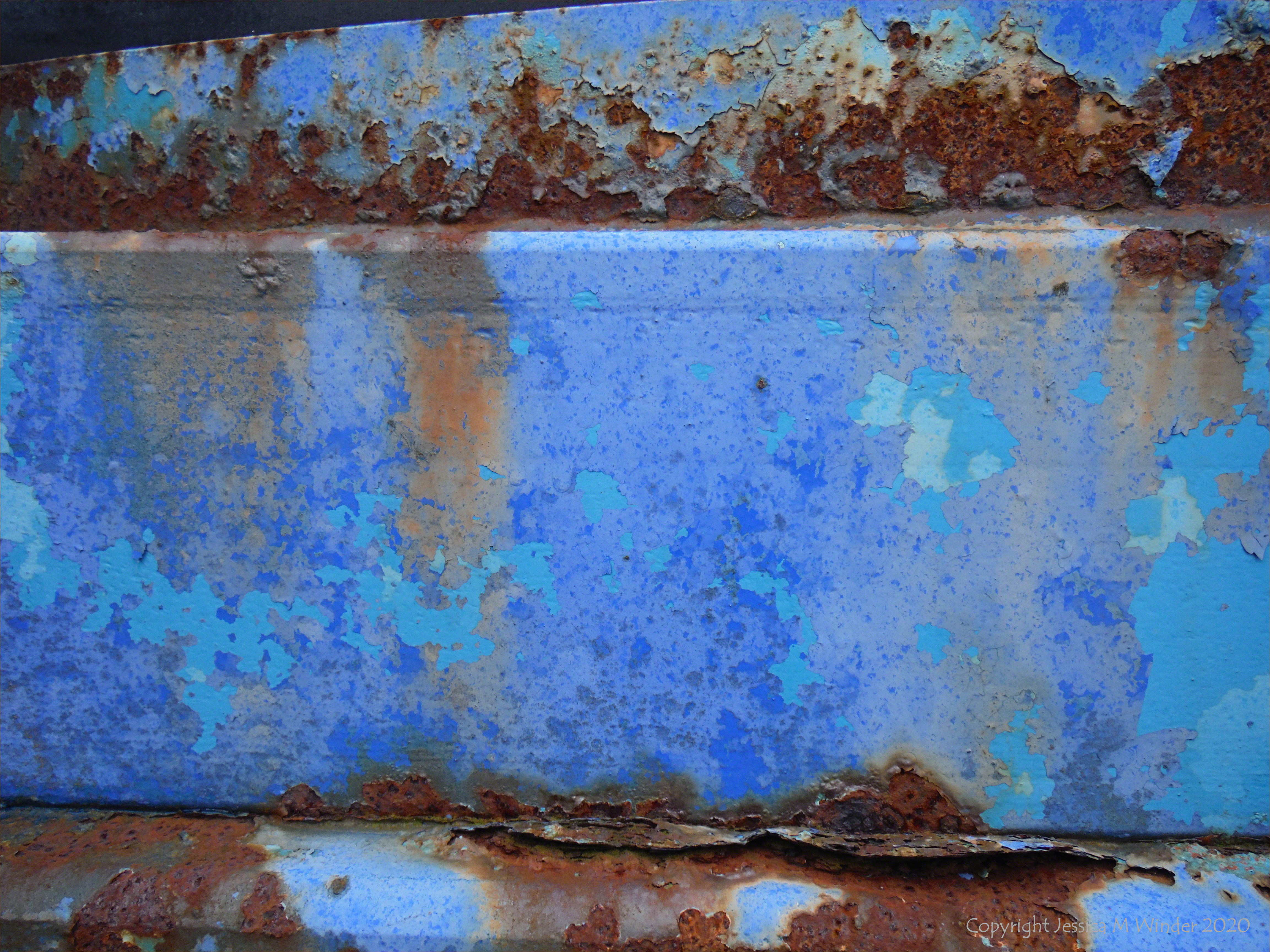 Rusty iron fittings and blue paint on an old piece of agricultural machinery left out to weather in the open air