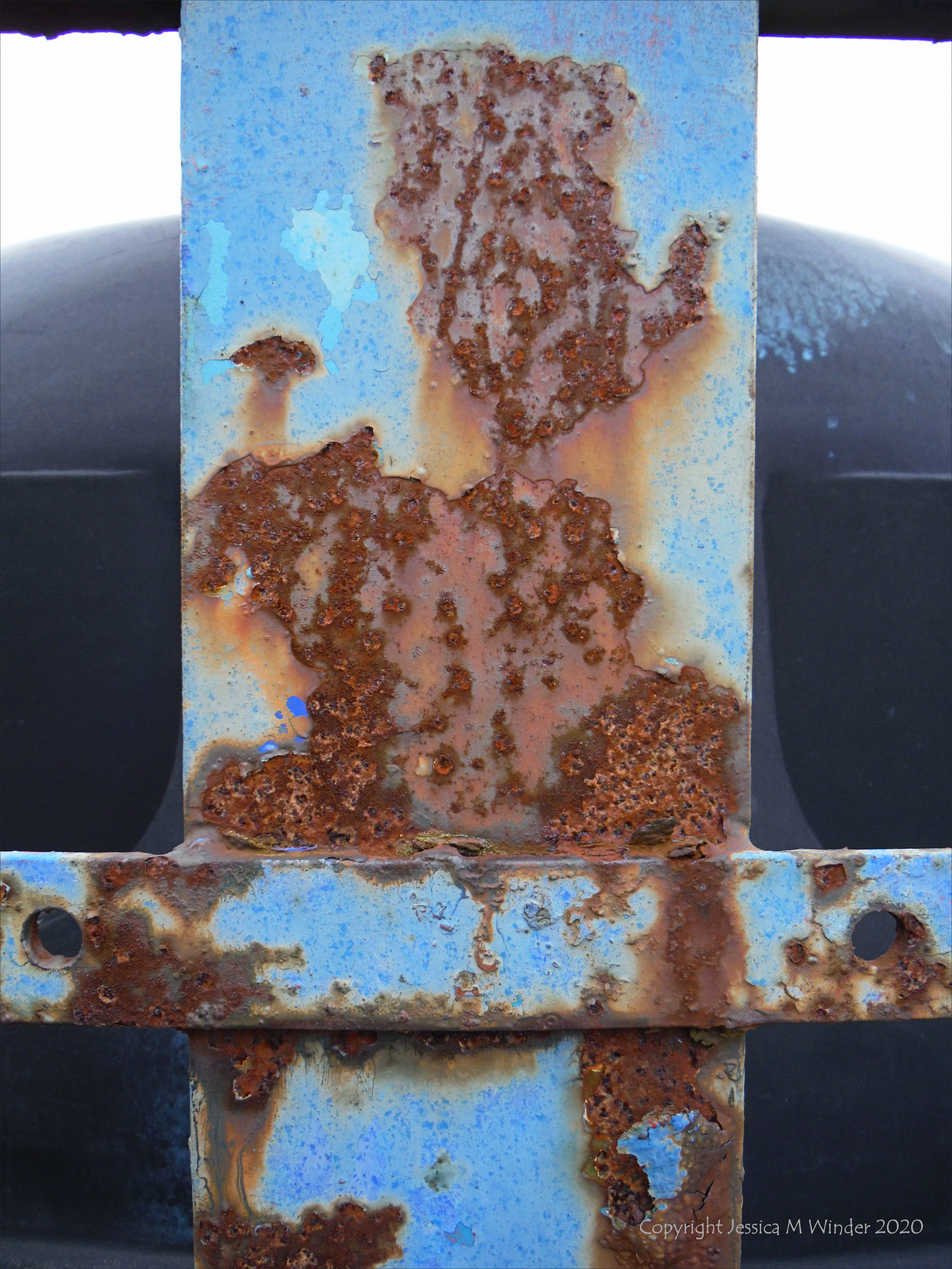 Rusty iron fittings and blue paint on an old piece of agricultural machinery left out to weather in the open air