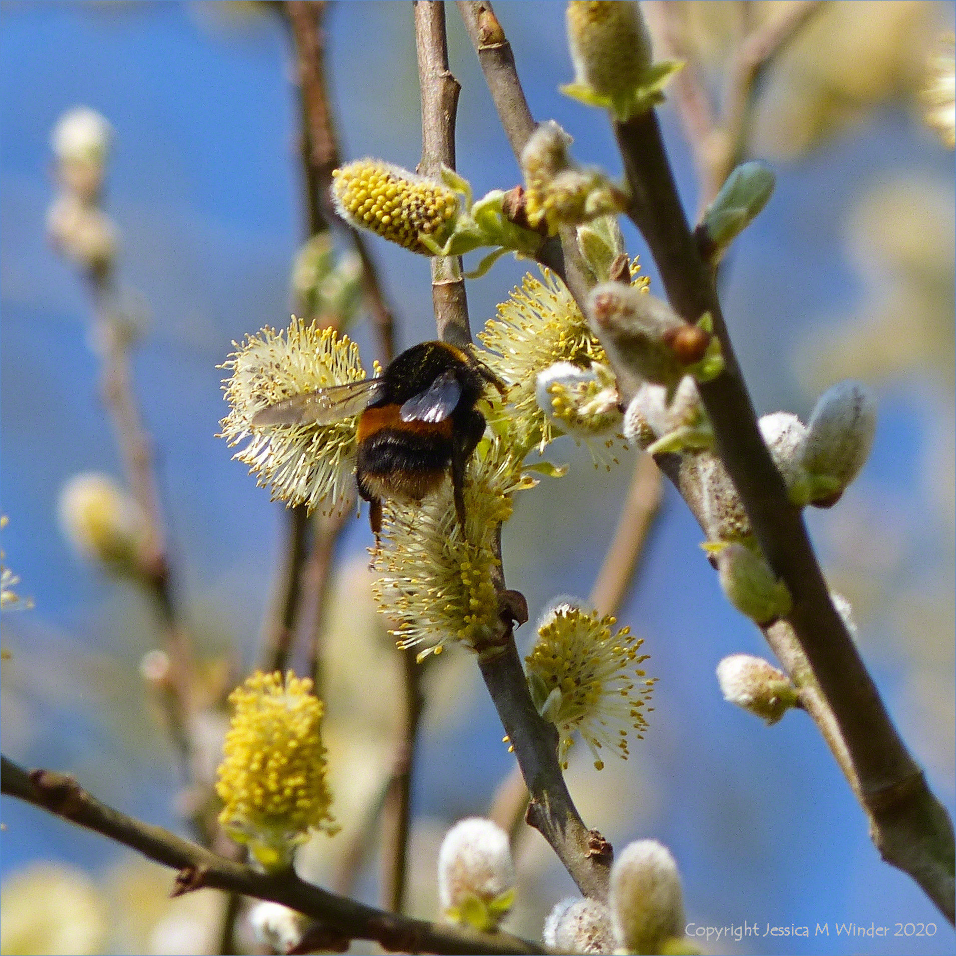 Daily Walk 5.6 Powdery yellow pussy willow flowers smother the leafless tree under a cloudless blue sky.