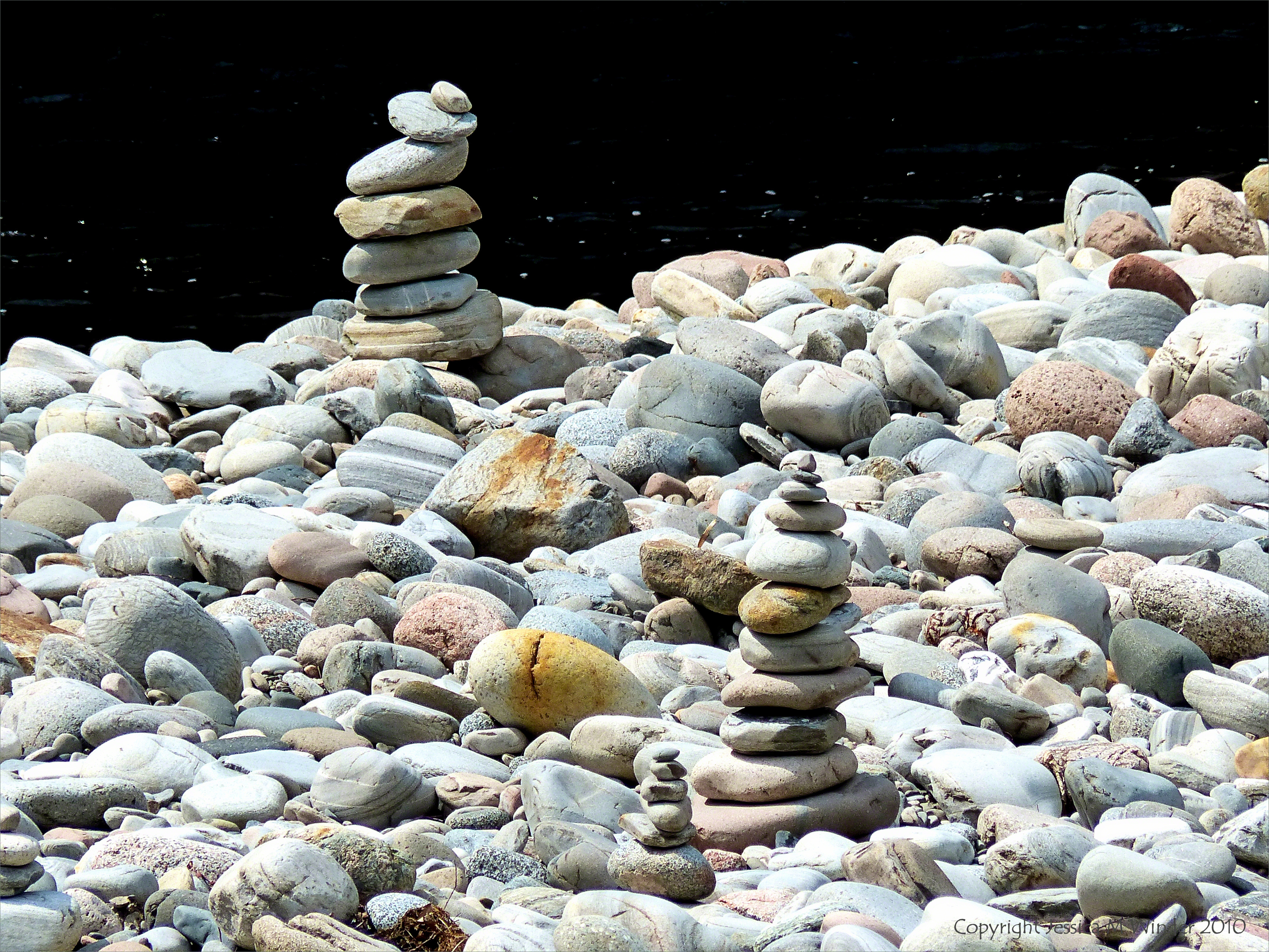 Pebble cairns by the River Garry at Killicrankie in Scotland