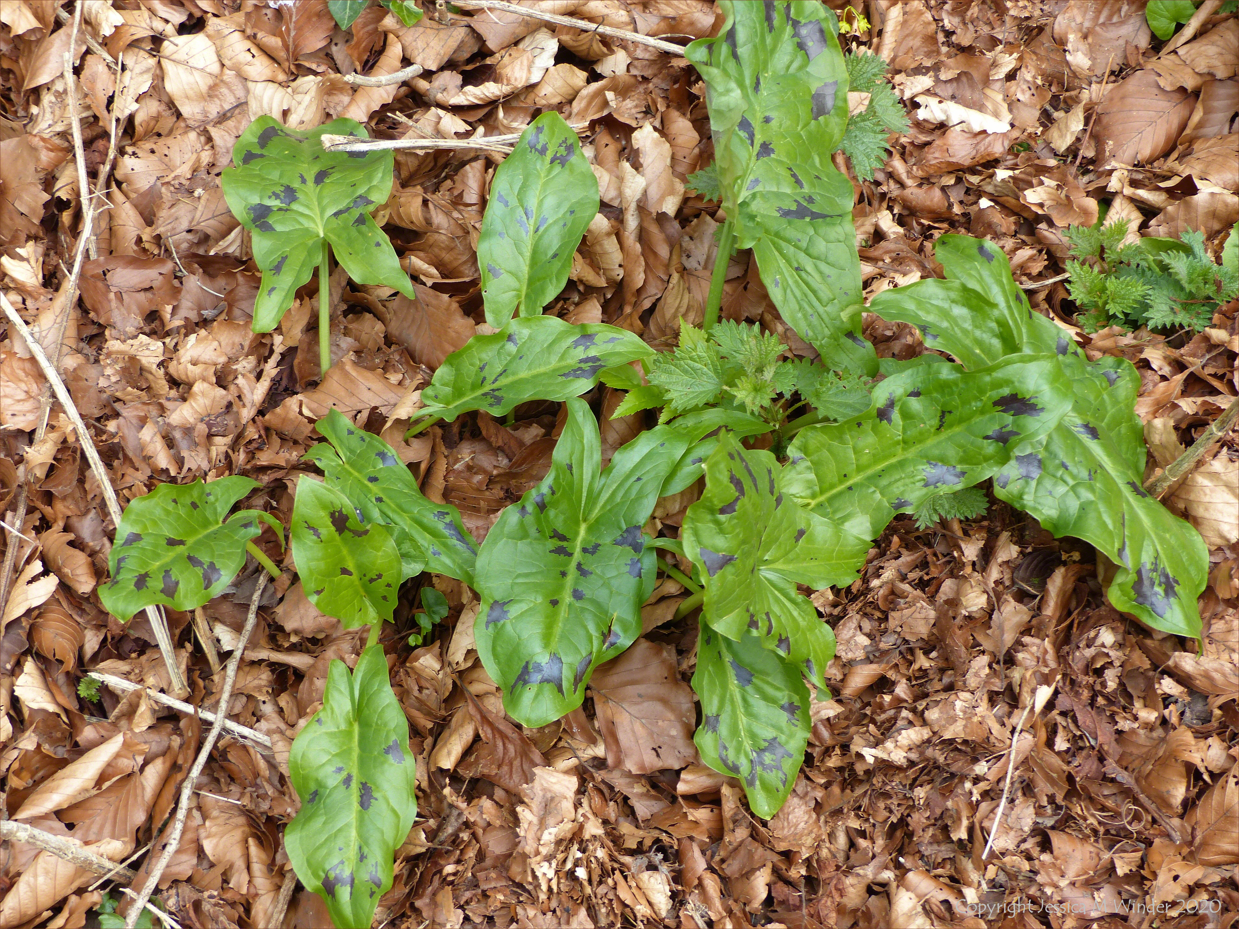 Leaves of Cuckoo Pint (Lords-and-Ladies) at Charlton Down in Dorset March 2020
