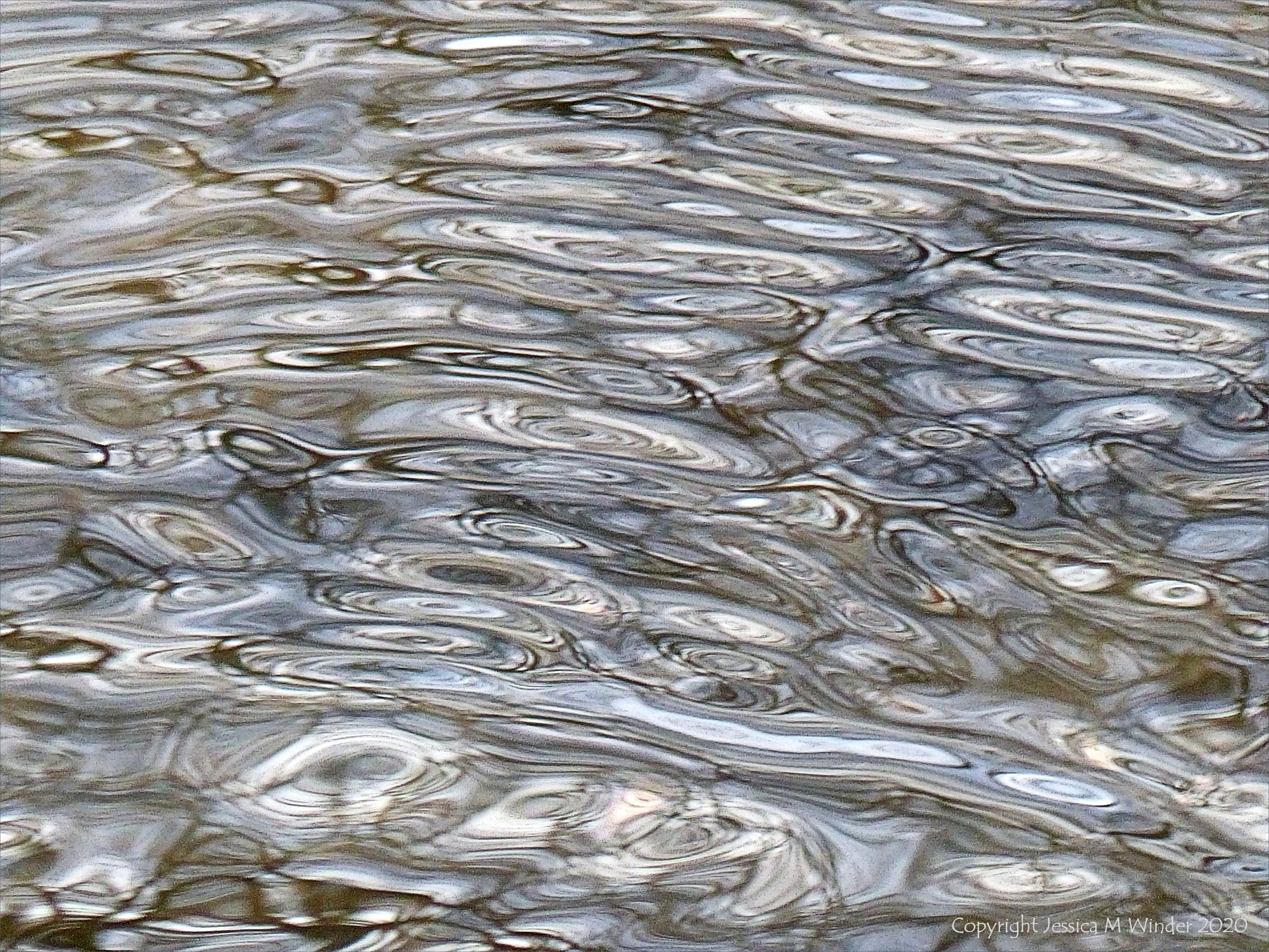 Abstract natural patterns of reflected light on a rippled water surface in a shallow flowing chalk river near Charlton Down in Dorset.