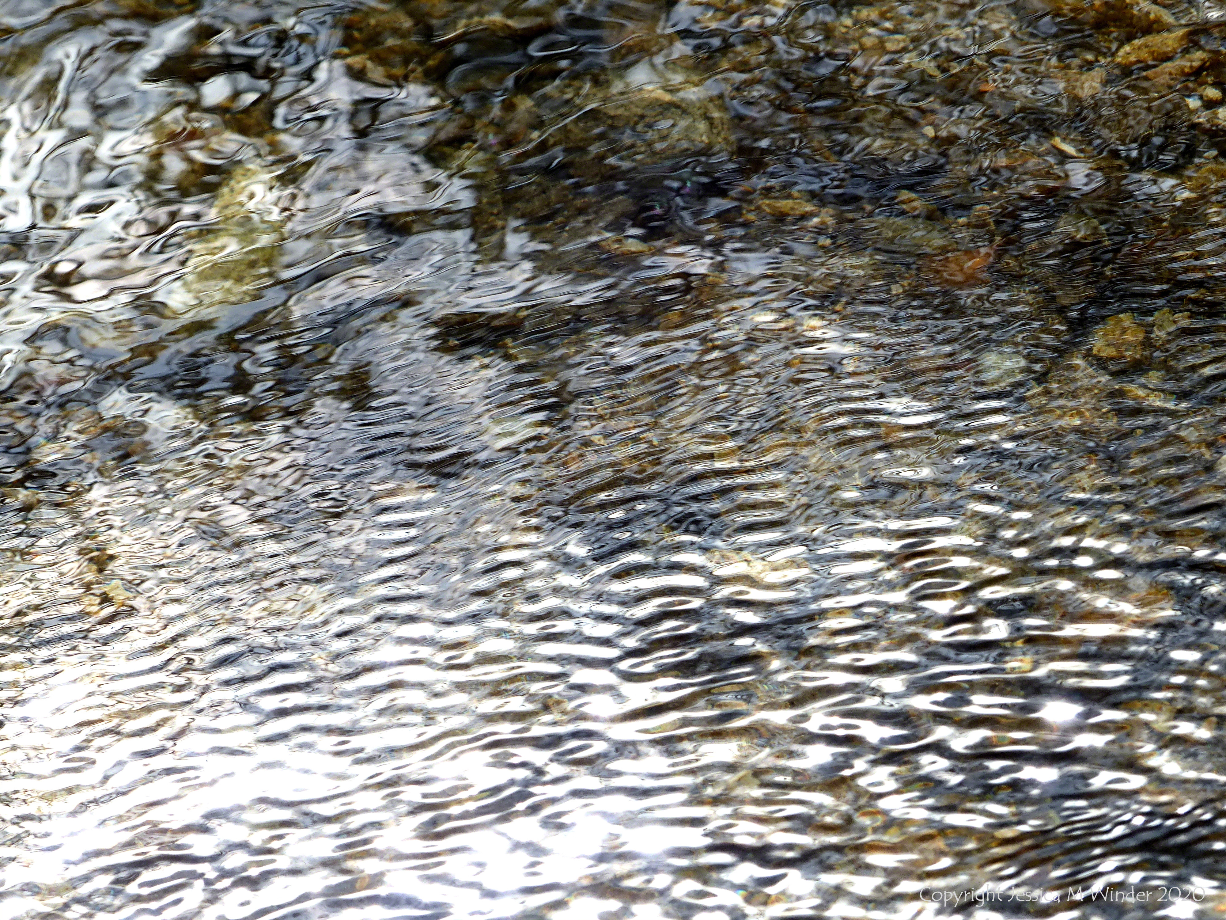 Abstract natural patterns of reflected light on a rippled water surface in a shallow flowing chalk river near Charlton Down in Dorset.